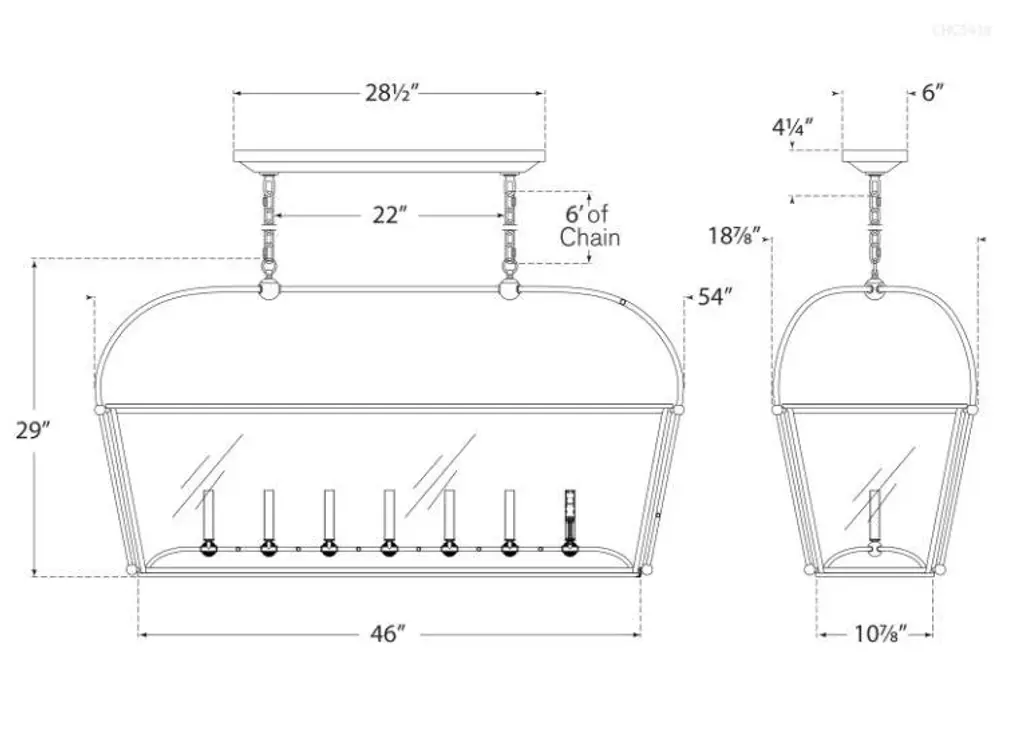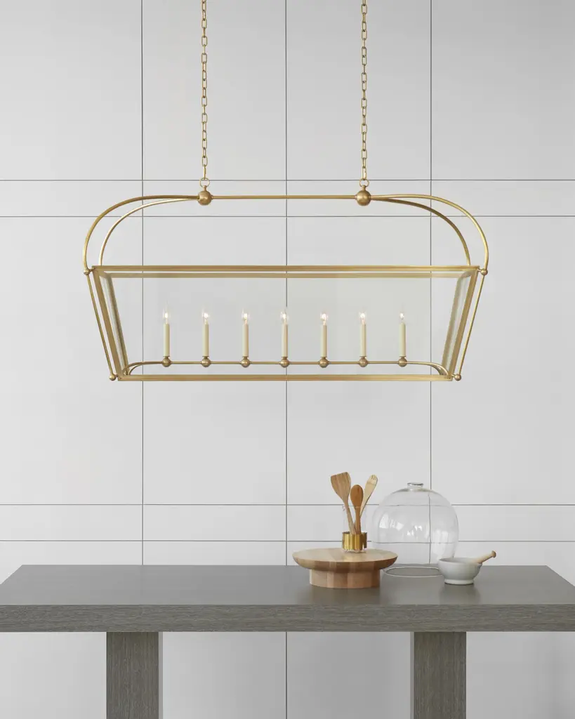 Riverside Large Linear Pendant in Antique-Burnished Brass with Clear Glass Designer: Chapman & Myers Fixture Height: 29" Canopy: 6" x 28.5" Rectangle Mounting: Chain Shade Detail: Clear Glass Socket: 7 - E12 Candelabra Wattage: 7 - 60 C11 Safety Rating Location: DAMP
