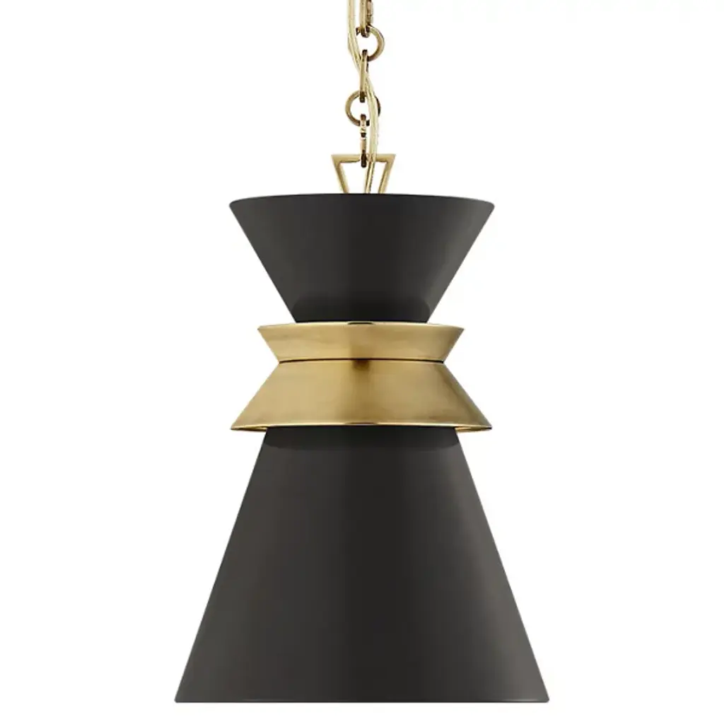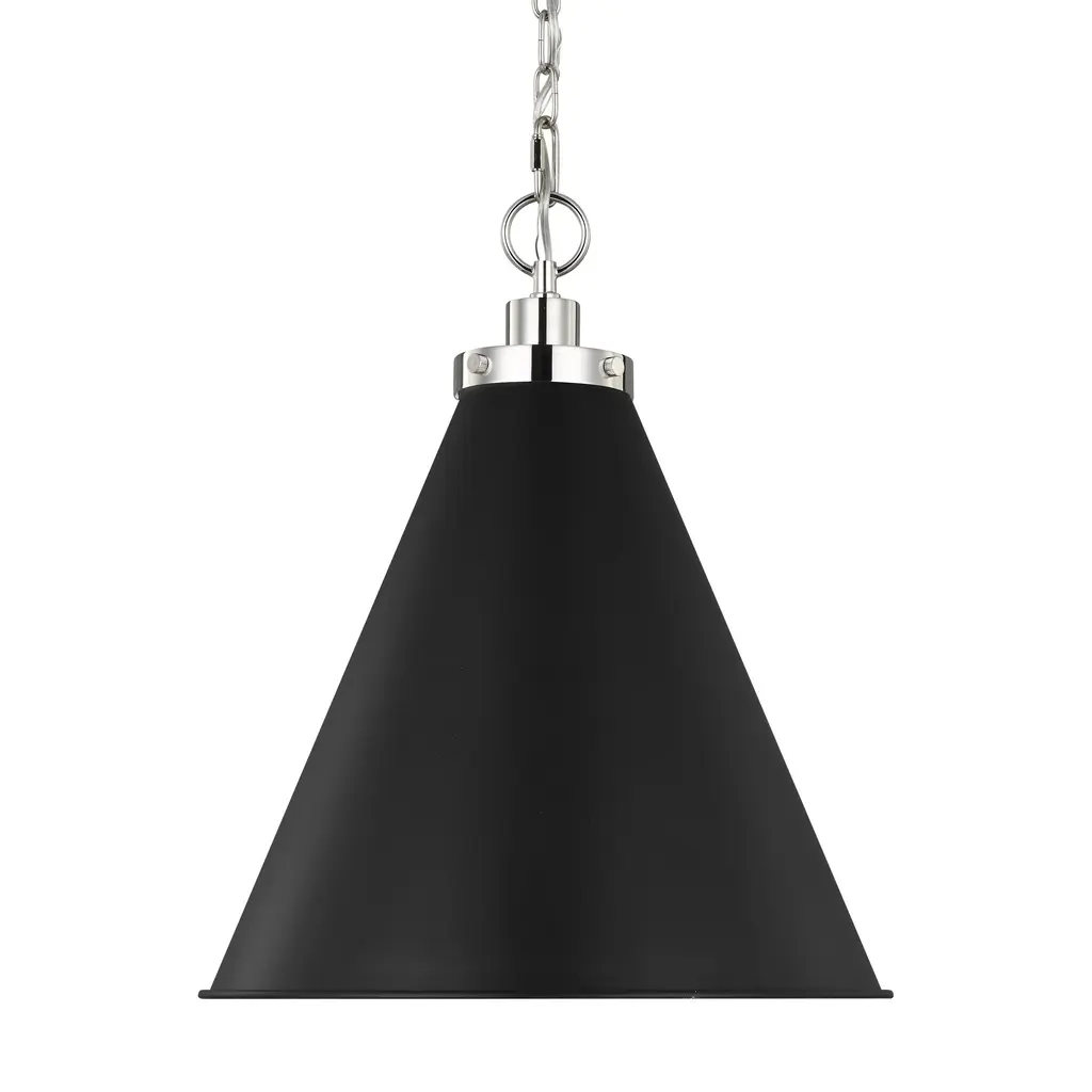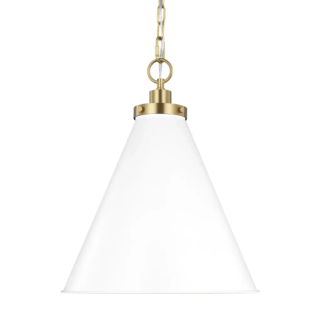 Accentuate your modern interior design with the chic and sophisticated Chapman & Myers Wellfleet Cone Pendant Light from Visual Comfort & Co. Made of smooth metal, its sharp-angled, conical shade holds a single crisp bulb that provides bright and even illumination. An elegant disc-shaped mount and thin chain link suspend this piece gracefully from the ceiling, creating an inviting atmosphere that is sure to impress. Highlights