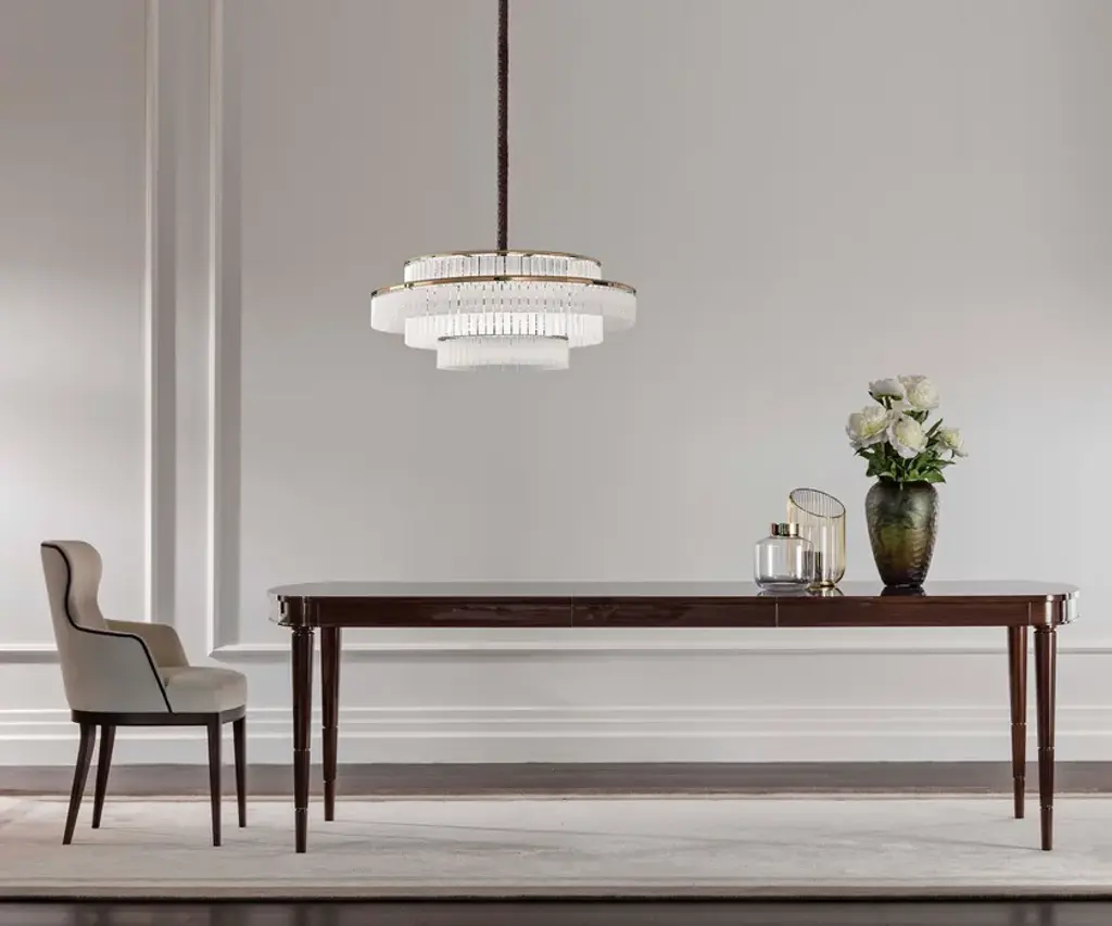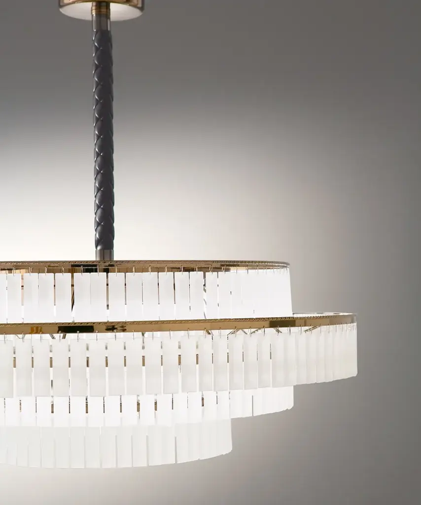 Consisting of four levels of satin-finished crystal details, with metal nickel gold structure and complete with suspension cable covered in leather, the chandelier Charles gives a refined atmosphere in any context. An illuminating body that does not go unnoticed, able to combine different materials and to project a soft light, expressing a sober richness that never goes towards excess. A solution that enhances environments where light becomes a fundamental decorative component. Available with satin or transparent glass.Electrical and technical characteristicsCRI>80Driver: included, not dimmable (on request dimmable with DALI and Casambi bluetooth)Voltage: 230 VEnergy class: A+IP20Certifications: CE/EAC