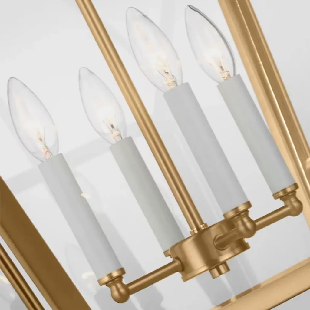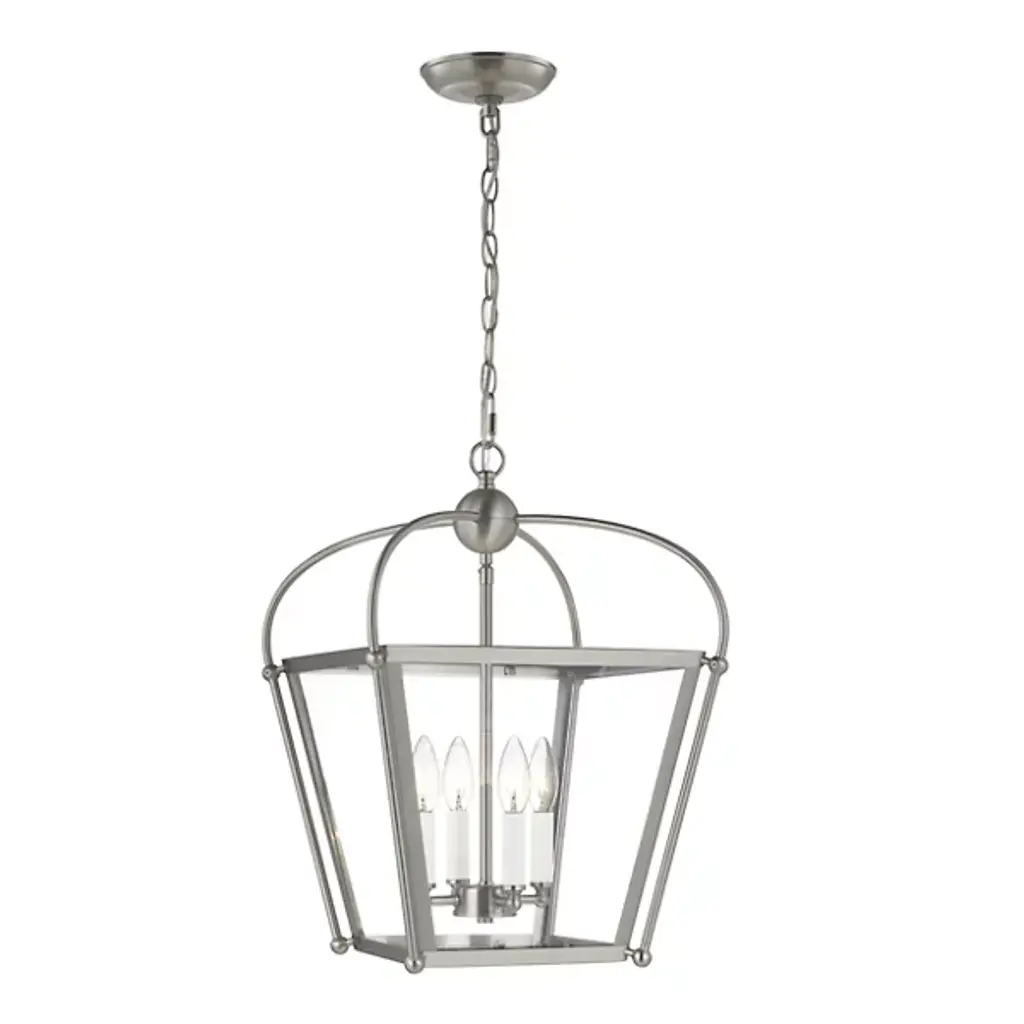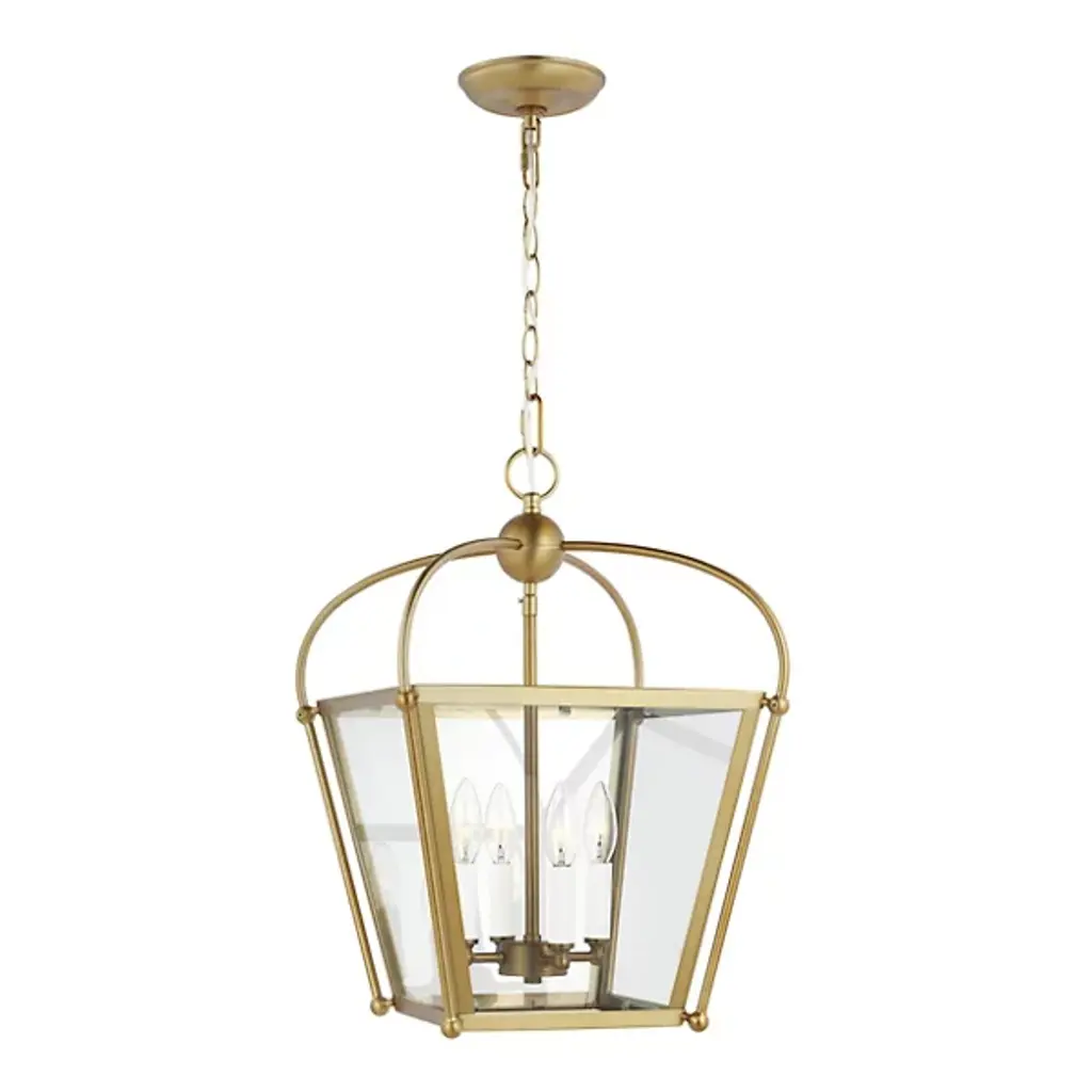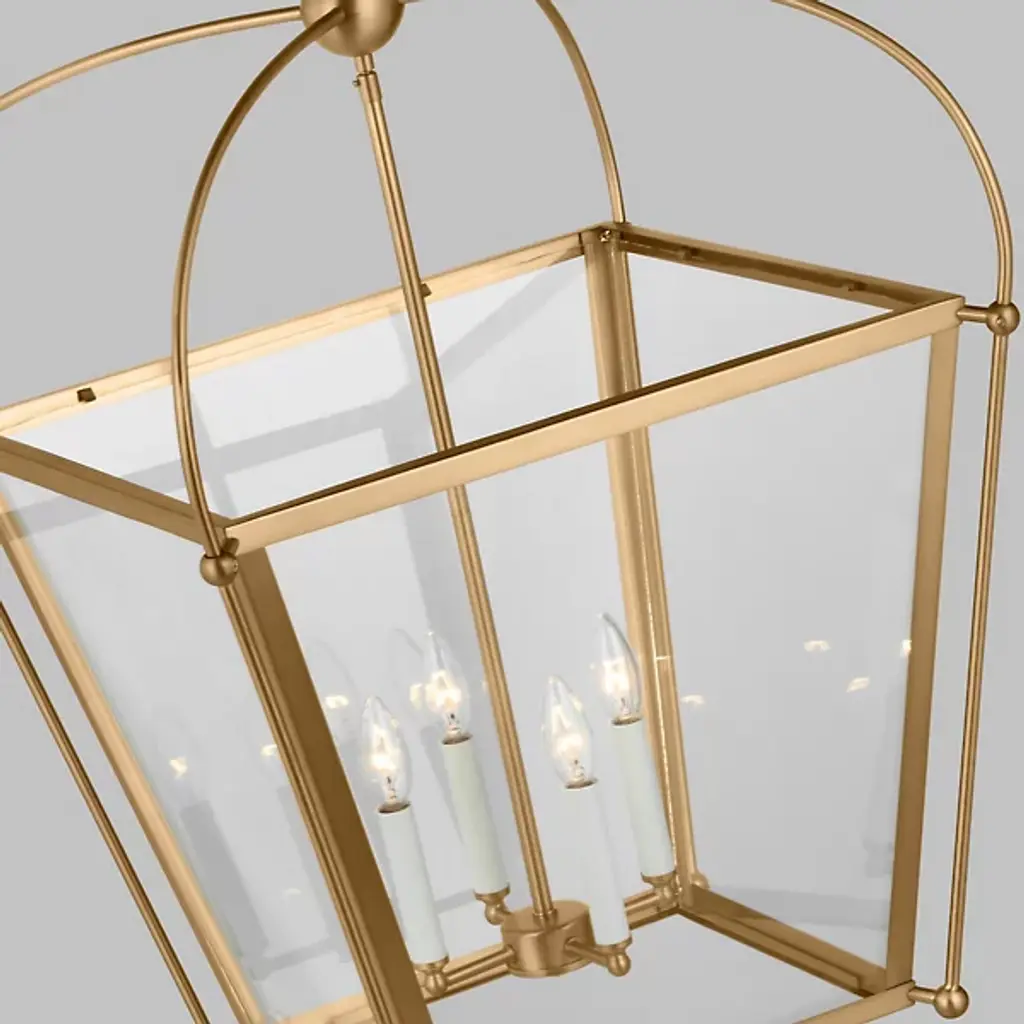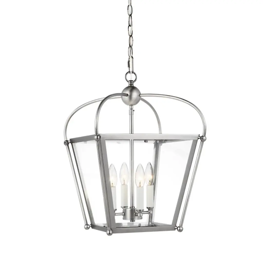Bring a traditional lantern shape to the comfort of your home with the Charleston Pendant from Visual Comfort Studio, formerly known as Sea Gull Lighting, Made entirely of smooth and clean metal, this piece elevates the décor instantly, creating an elegant presentation. A chainlink lowers from the ceiling, leading to a central sphere and a set of four gracefully curving arms that each leads to a side of the body. A set of candelabra-style bulbs rest at the center, diffusing out a welcoming layer of light.