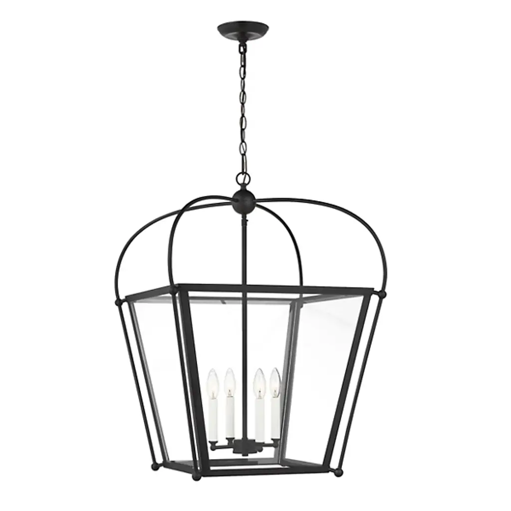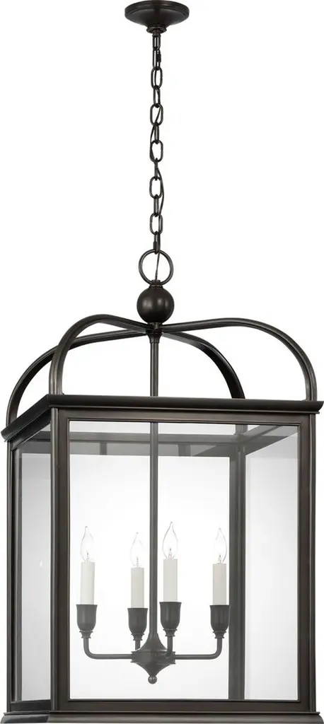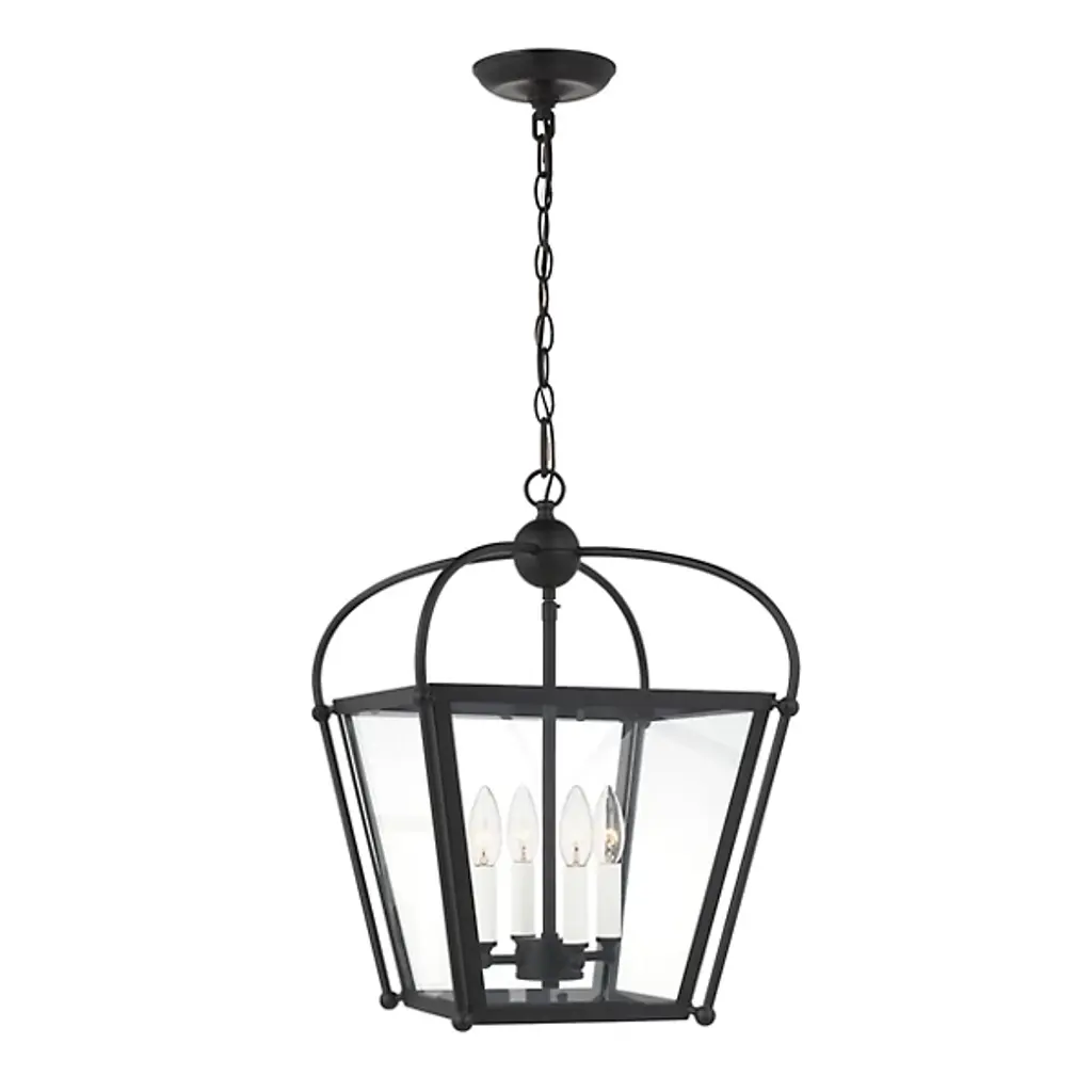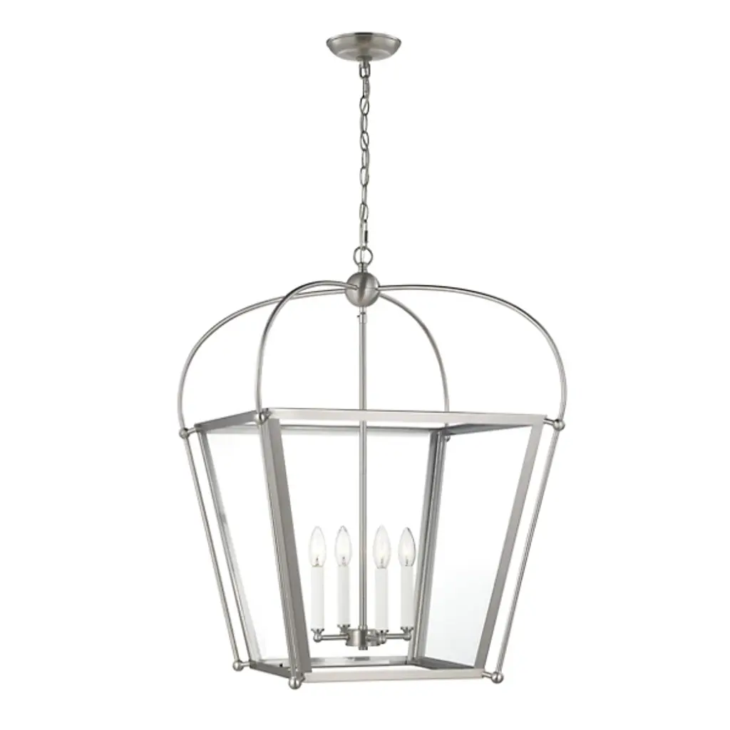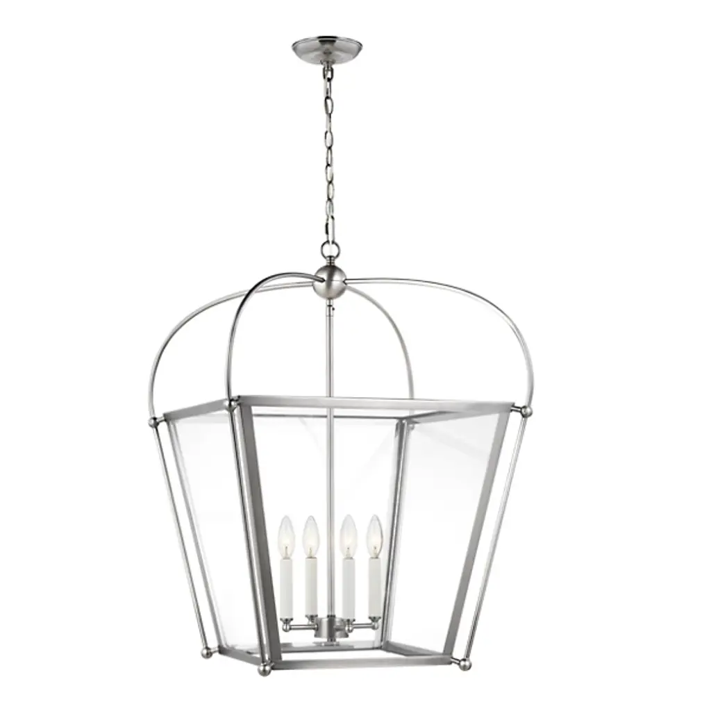 Bring a traditional lantern shape to the comfort of your home with the Charleston Pendant from Visual Comfort Studio, formerly known as Sea Gull Lighting, Made entirely of smooth and clean metal, this piece elevates the décor instantly, creating an elegant presentation. A chainlink lowers from the ceiling, leading to a central sphere and a set of four gracefully curving arms that each leads to a side of the body. A set of candelabra-style bulbs rest at the center, diffusing out a welcoming layer of light.