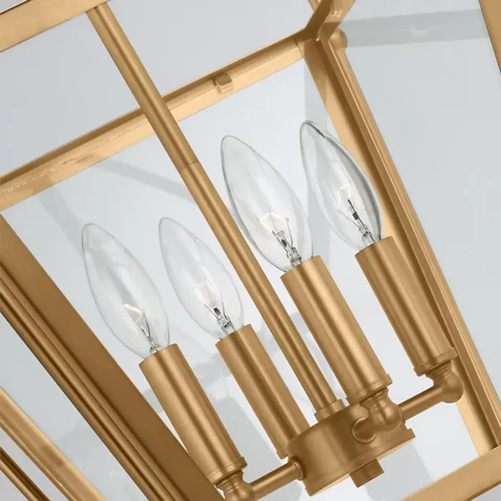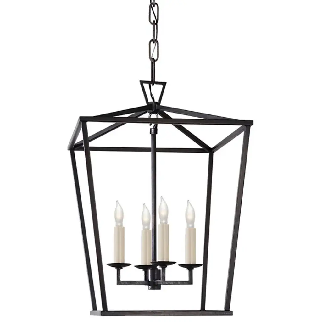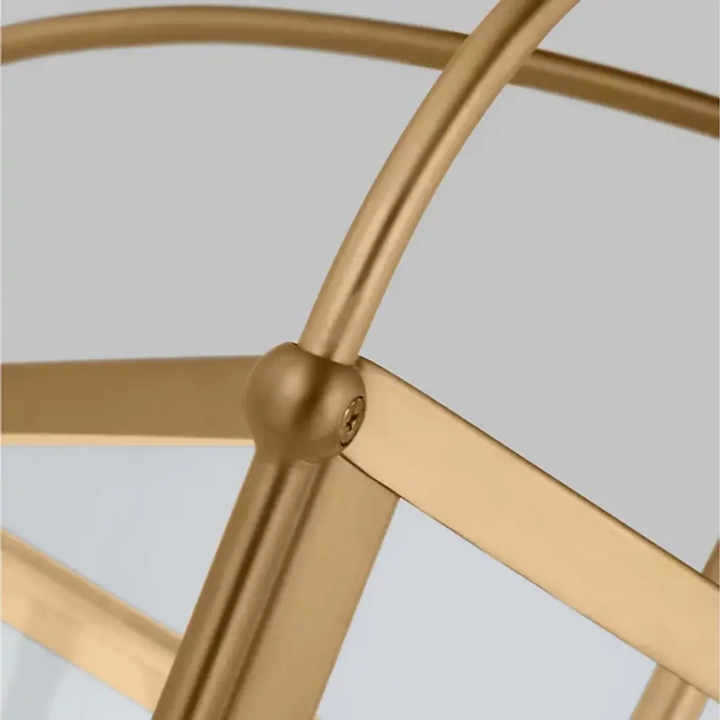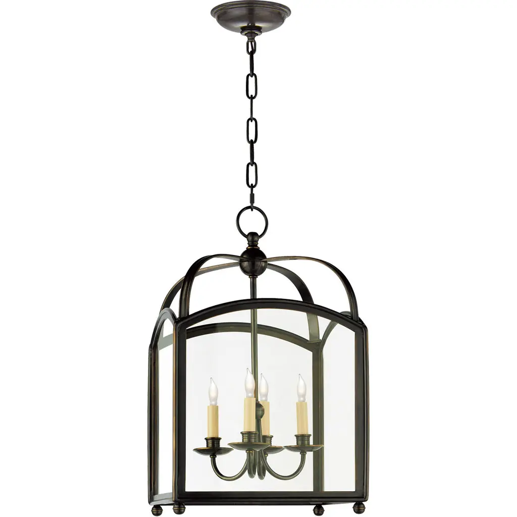 Bring a traditional lantern shape to the comfort of your home with the Charleston Pendant from Visual Comfort Studio, formerly known as Sea Gull Lighting, Made entirely of smooth and clean metal, this piece elevates the décor instantly, creating an elegant presentation. A chainlink lowers from the ceiling, leading to a central sphere and a set of four gracefully curving arms that each leads to a side of the body. A set of candelabra-style bulbs rest at the center, diffusing out a welcoming layer of light.