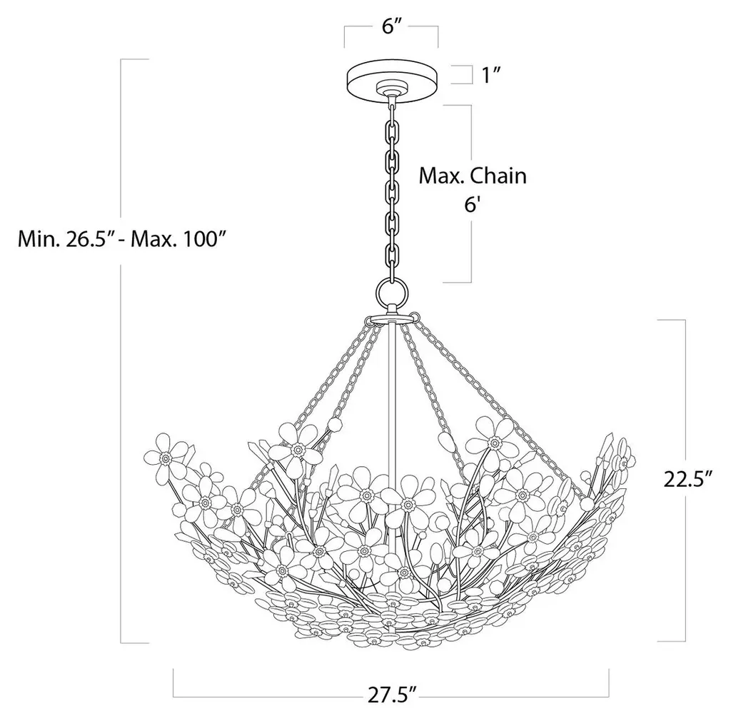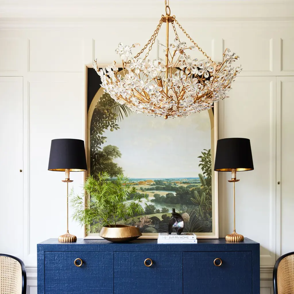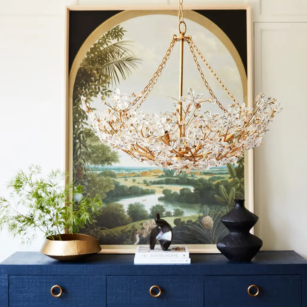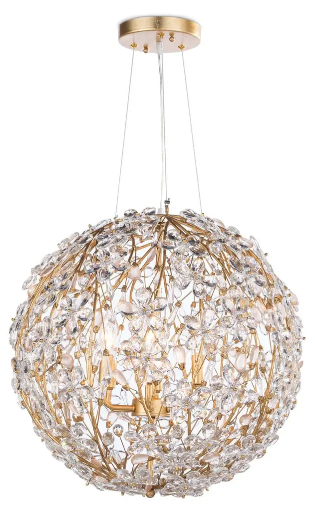 Crafted of steel with a gold-leaf finish and bevy of clear crystal flowers, this fixture adds a refreshing, spirited note to any space. Hardwired.