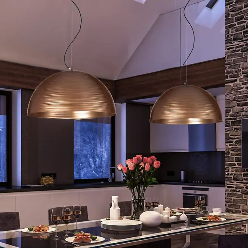 Quiet yet elaborate. The Chiara Pendant from Metal Lux welcomes one with a familiar dome shape and keeps the eyes intrigued with artful striations. Designer Studio Tecnico Metallux rethinks classic lighting forms with a contemporary aesthetic. Here, the studio celebrates the time-tested hemisphere shade. Hanging with fine wire, the metal dome shade contrasts its smooth curves with a linear surface texture. A touch of light hitting the linear pattern accentuates their lively character. Hidden inside for reduced glare, bright bulbs send a soft down glow traveling through the wide opening of the dome.