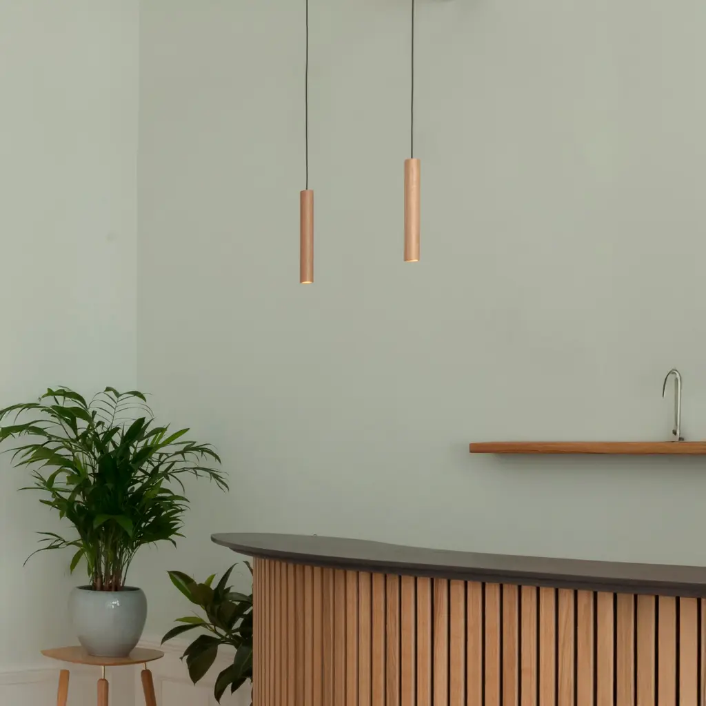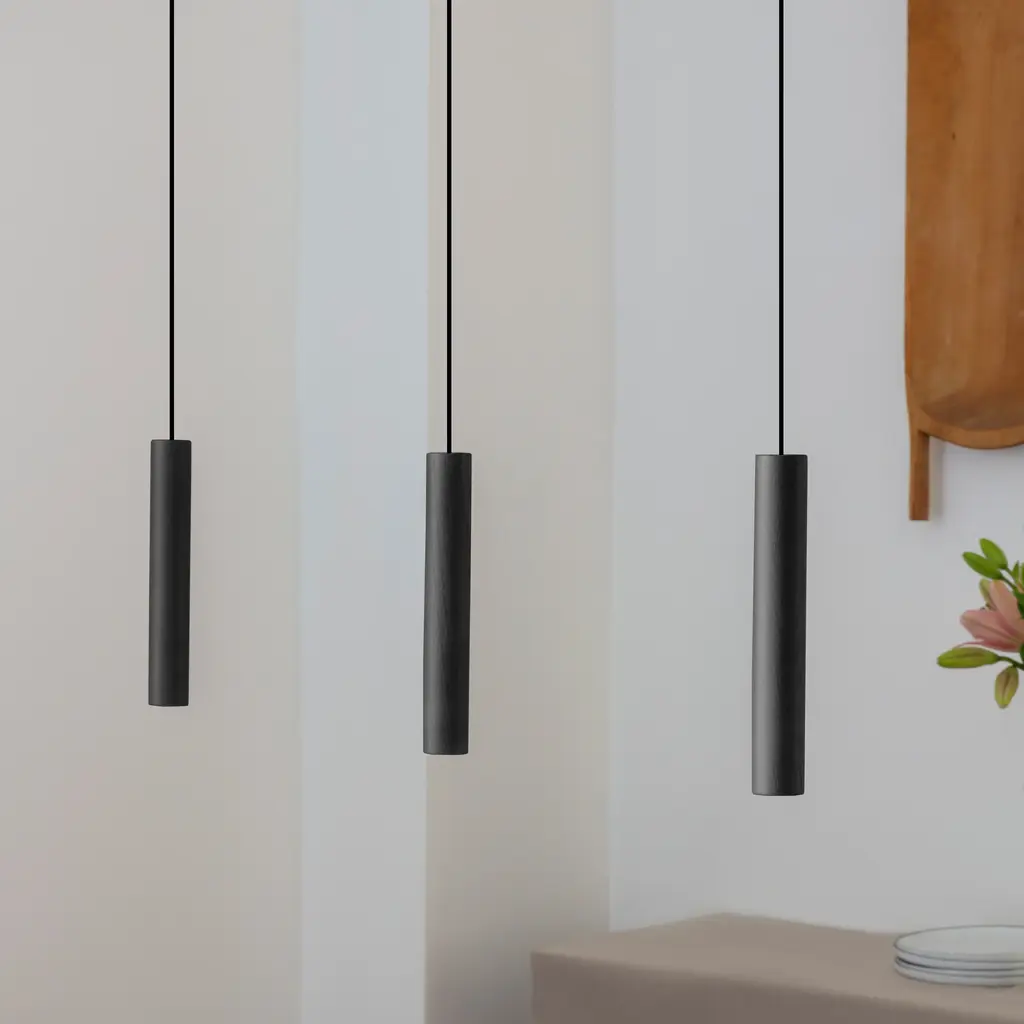 The Chimes Pendant Lamp is a simple lighting piece made from solid oak, inspired by the vertical lines of trees in a dense forest. Its slim, cylindrical shape houses a warm LED light source, offering focused lighting suited for spaces like kitchen counters or reading corners. Reflecting Nordic design traditions, multiple Chimes lamps can be arranged in rows or clusters to create a warm and inviting ambiance. Available in 3 different oak finishes.