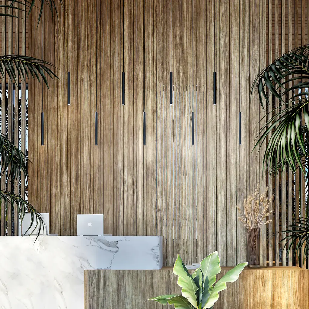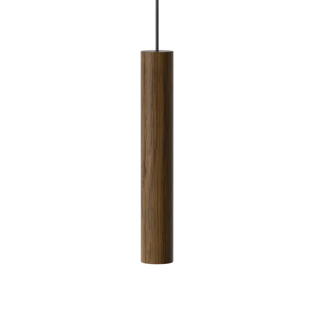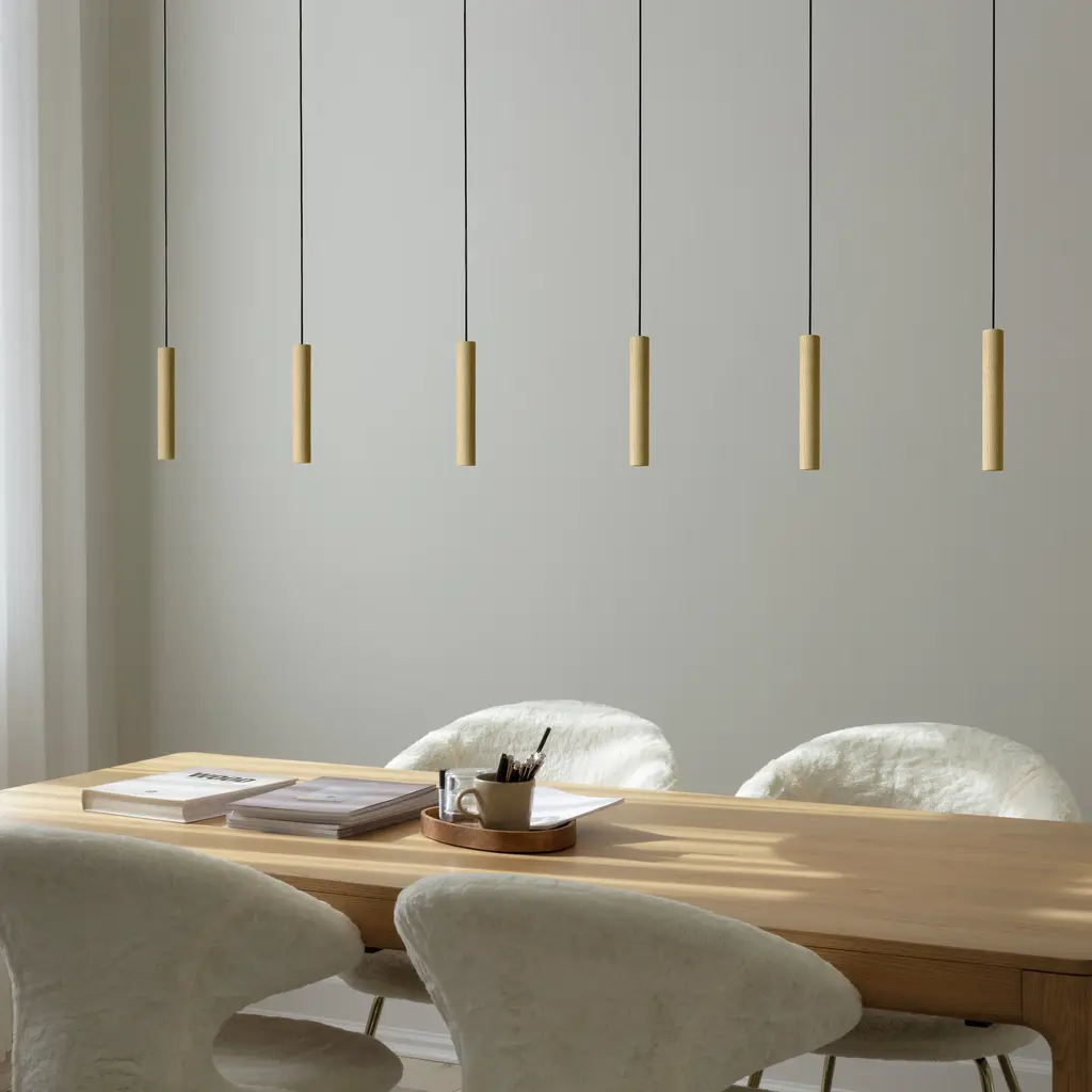 The Chimes Pendant Lamp is a simple lighting piece made from solid oak, inspired by the vertical lines of trees in a dense forest. Its slim, cylindrical shape houses a warm LED light source, offering focused lighting suited for spaces like kitchen counters or reading corners. Reflecting Nordic design traditions, multiple Chimes lamps can be arranged in rows or clusters to create a warm and inviting ambiance. Available in 3 different oak finishes.