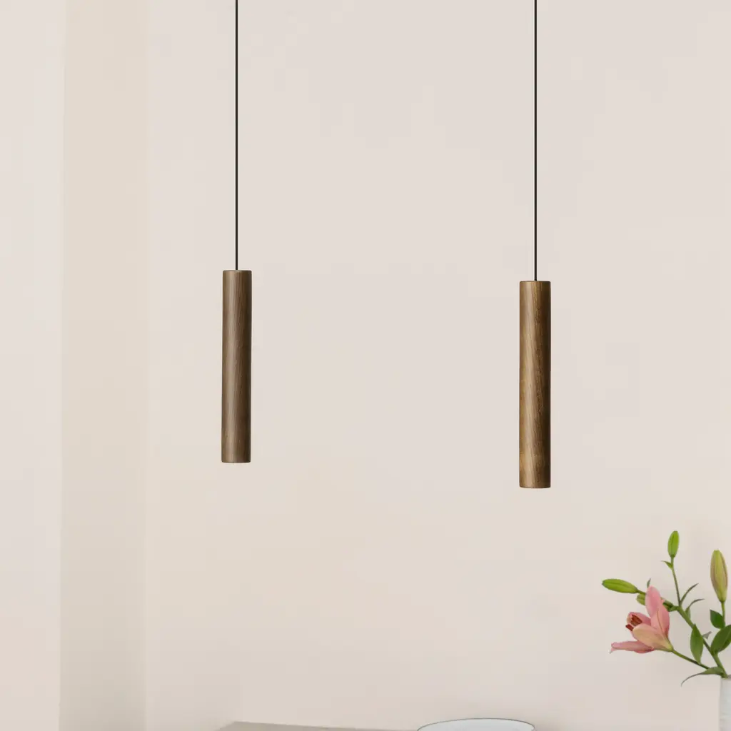 The Chimes Pendant Lamp is a simple lighting piece made from solid oak, inspired by the vertical lines of trees in a dense forest. Its slim, cylindrical shape houses a warm LED light source, offering focused lighting suited for spaces like kitchen counters or reading corners. Reflecting Nordic design traditions, multiple Chimes lamps can be arranged in rows or clusters to create a warm and inviting ambiance. Available in 3 different oak finishes.