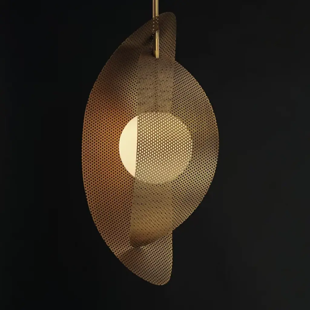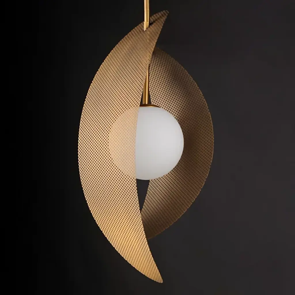 Influenced by the playful aesthetic of pop art and sculpture, the Chips Pendant by Studio M features thinly curved panels of perforated metal shades illuminated by LED globes of Satin White glass positioned strategically along the span of suspended chip-like sculptures. Despite their voluminous expansiveness, the panels maintain an airy elegance due to their perforated construction. Aptly named and fabulously functional, lighting products reflect the personality inherent in Mat Sanders' designs. Recipient of the Adex Platinum Award in 2023, this pendant epitomizes contemporary style with its fusion of artistic expression and functional design.