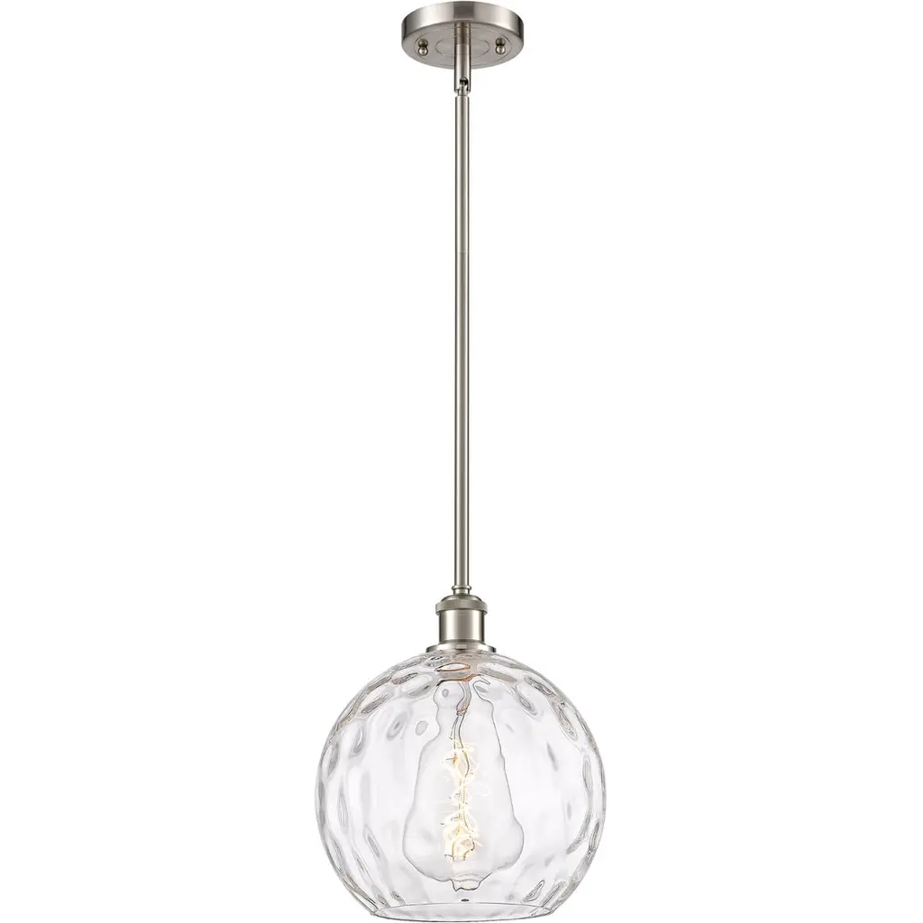 Define your modern space with the eye-catching, streamlined presence of this one-light pendant. Rounded shades are made from clear, water-textured glass, suspended from a sleek steel frame with a brushed nickel finish. Your contemporary dining room or family space gets an instant boost with this sophisticated fixture.