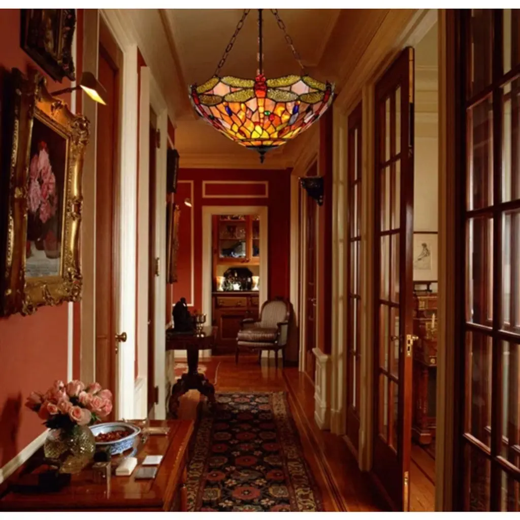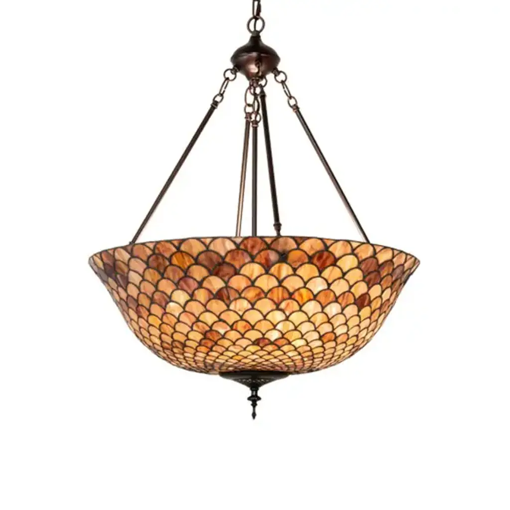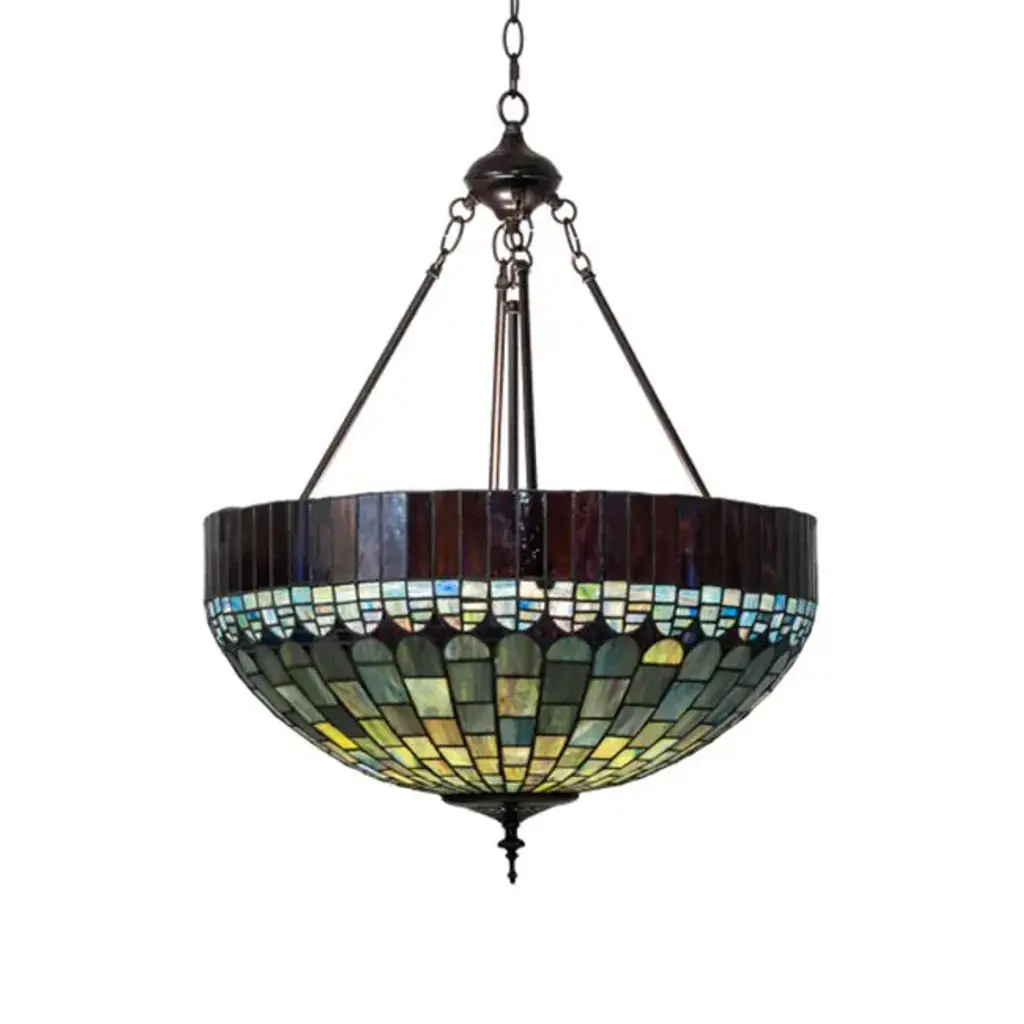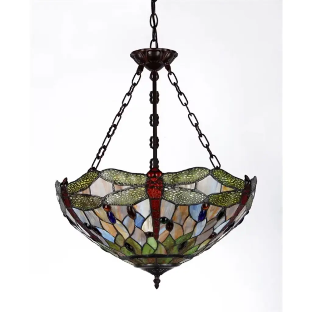 Bring timeless artistry and luminous color to your ceiling with the Anisoptera Purity Tiffany-style pendant. This inverted fixture features an iconic dragonfly motif handcrafted from 282 pieces of stained glass and 54 shimmering beads. Gem-toned accents and warm light projection create a radiant ambiance, while the antique bronze finish complements classic and vintage interiors. A graceful centerpiece for dining rooms, foyers, or living spaces. Key Features: Handmade with 282 stained glass cuts and 54 decorative glass beadsDragonfly design with soft gem tones offers an elegant, nostalgic appealCrafted using Tiffany’s authentic copper foil techniqueHardwired pendant with 84" adjustable chain for flexible ceiling heightDimensions: 18"W x 23"H | Glass Thickness: 0.12" |Weight: 8.5 lbs A glowing tribute to Tiffany-style tradition, this piece elevates your decor with warmth and sophistication.