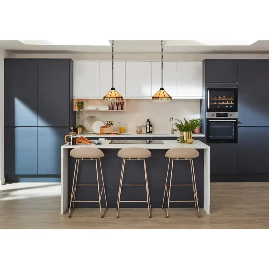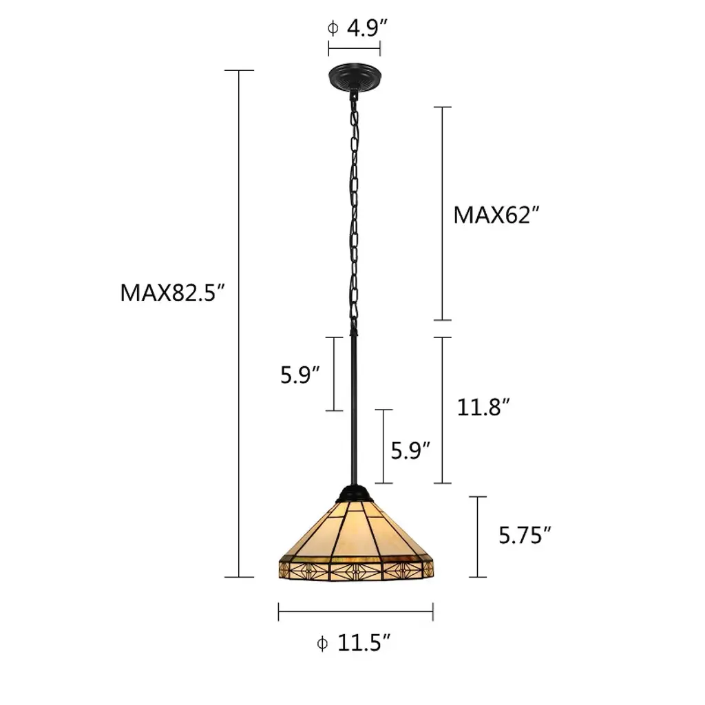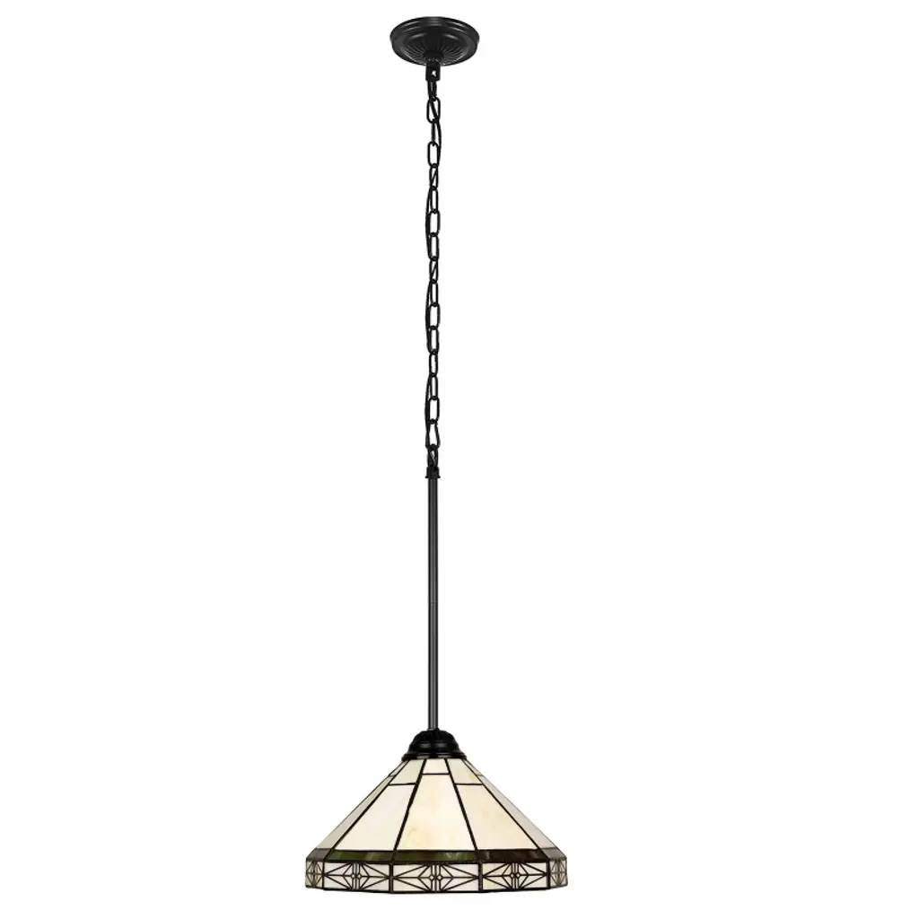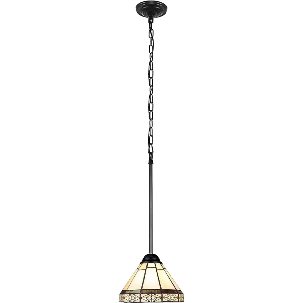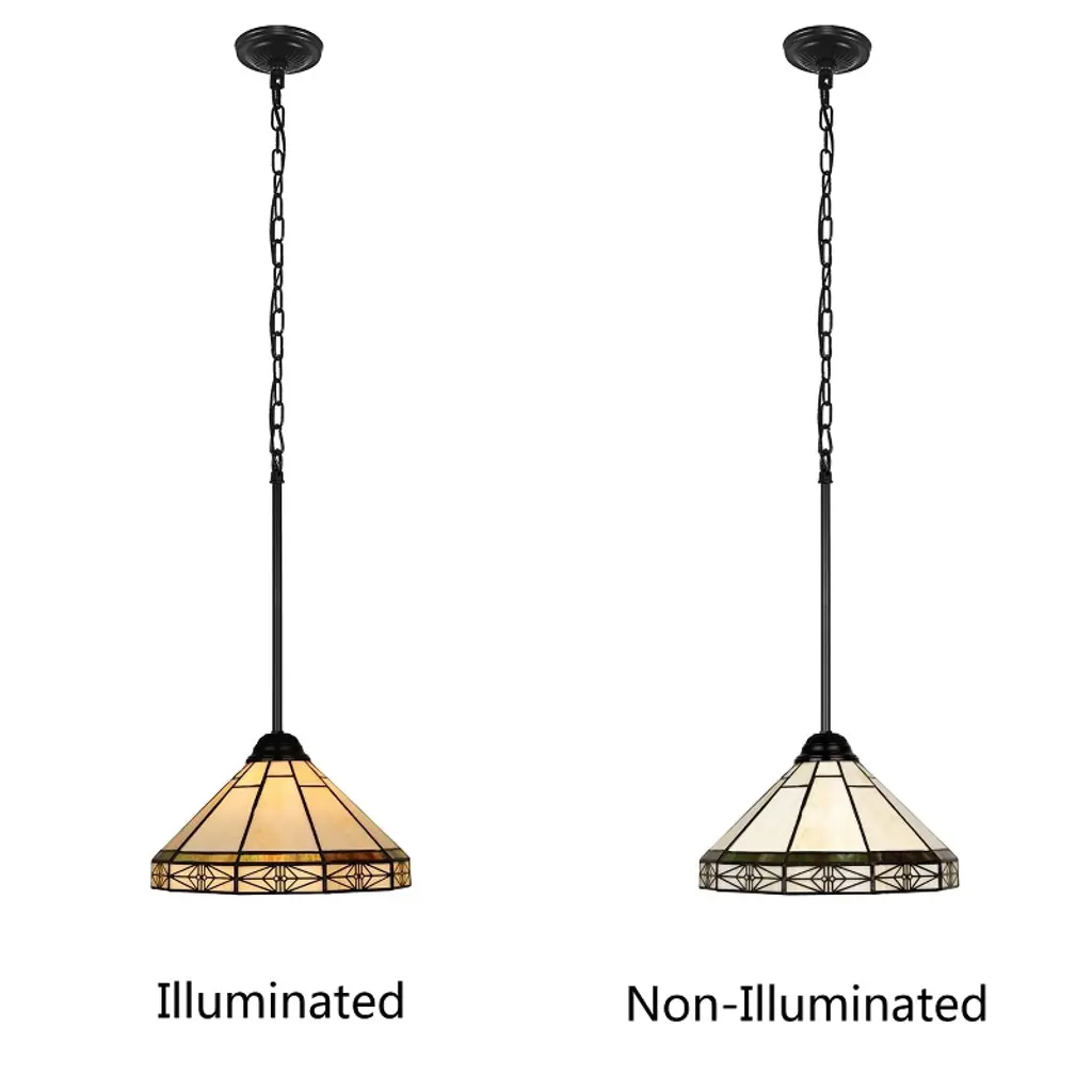 Belle is a beautifully designed mission-style, stained glass ceiling pendant. The shade on this pendant is made up of 70 pieces of hand-cut stained art glass, expertly pieced and soldered together to create each shade. Each shade is formed using the very same technique developed by Louis Comfort Tiffany in the early 1900s, using hand-cut stained art glass, each wrapped in fine copper foil and soldered together at extremely high temperatures to form each unique shade. The exact size to the nearest inch may vary, and the exact color of each glass piece may vary due to each piece being handcrafted. The first image is with the light shining through, the second image is with no light. Dry-listed and recommended for an indoor setting.