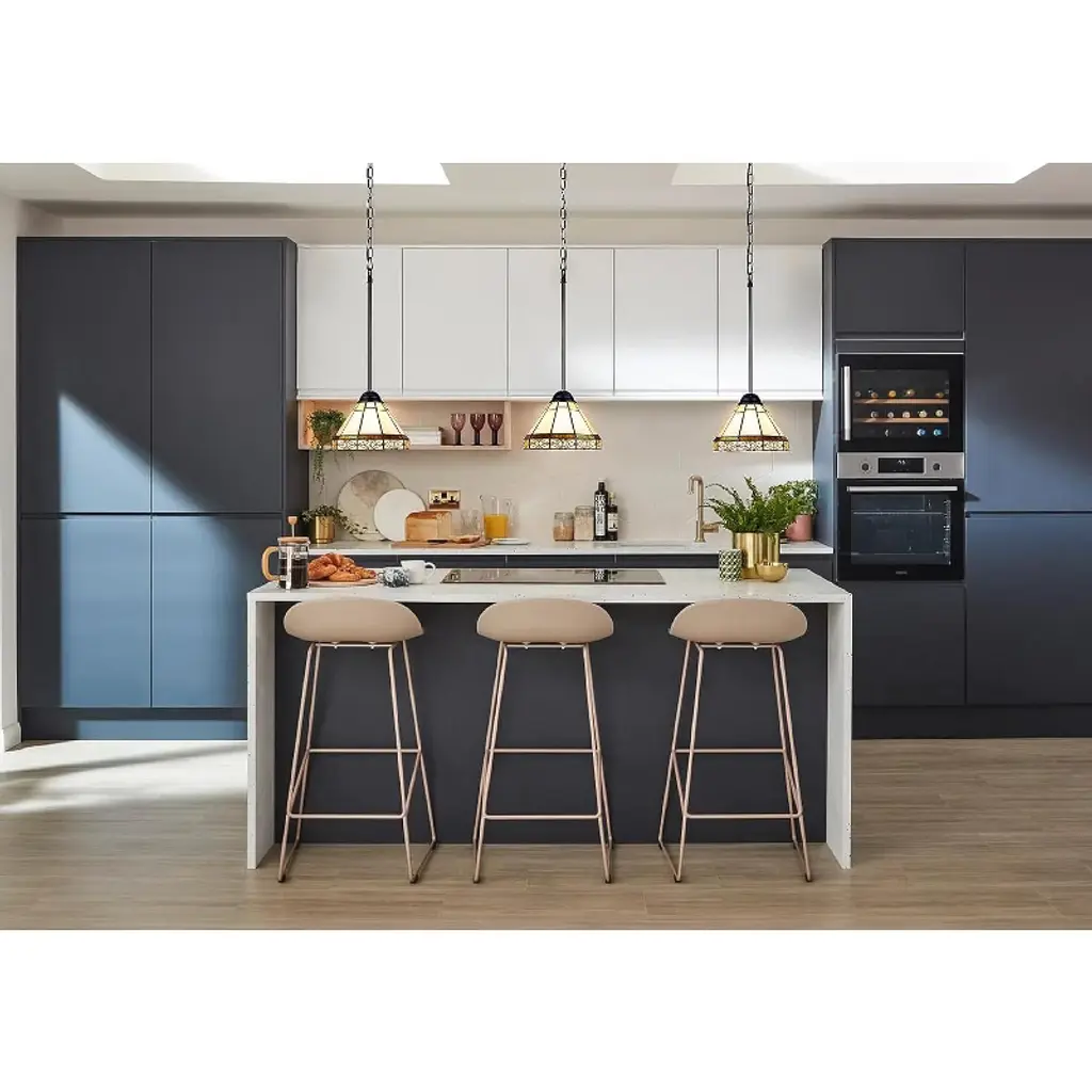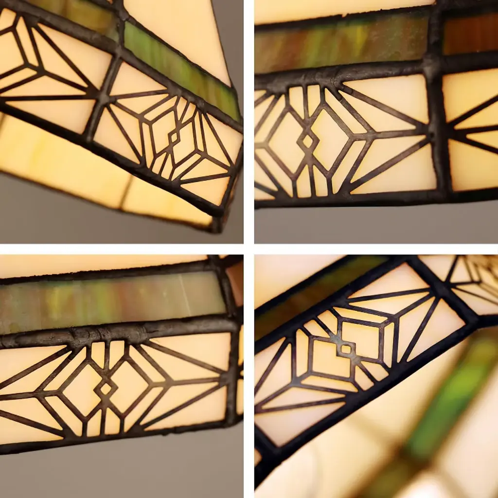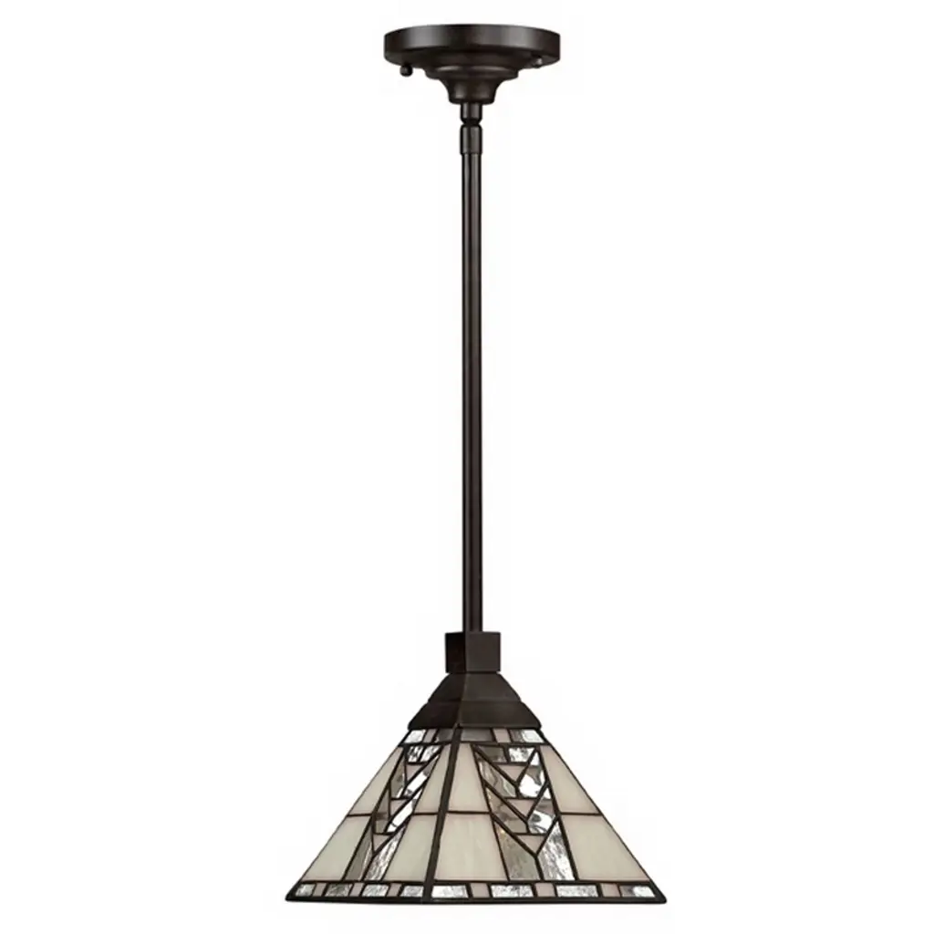 Belle is a Mission-design 1-light Tiffany-style hanging mini-pendant that would be a perfect fit in a dining room, living room, and foyer! The shade is hand-crafted, using the same methods developed by Louis Comfort Tiffany in the early 1900s. This process entails using 40 hand-cut stained art glass pieces each wrapped in fine copper foil and soldered together at extremely high temperatures to form each unique piece. The exact size to the nearest inch may vary, and the exact color of each glass piece may vary due to each piece being hand-crafted. The first image is with the light shining through, the second image is with no light. Dry-listed and recommended for an indoor setting.
