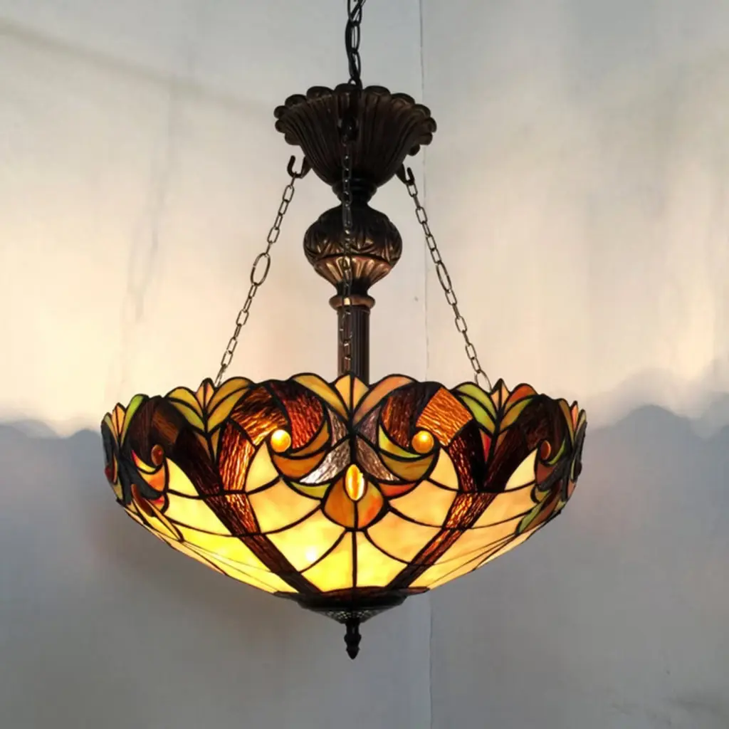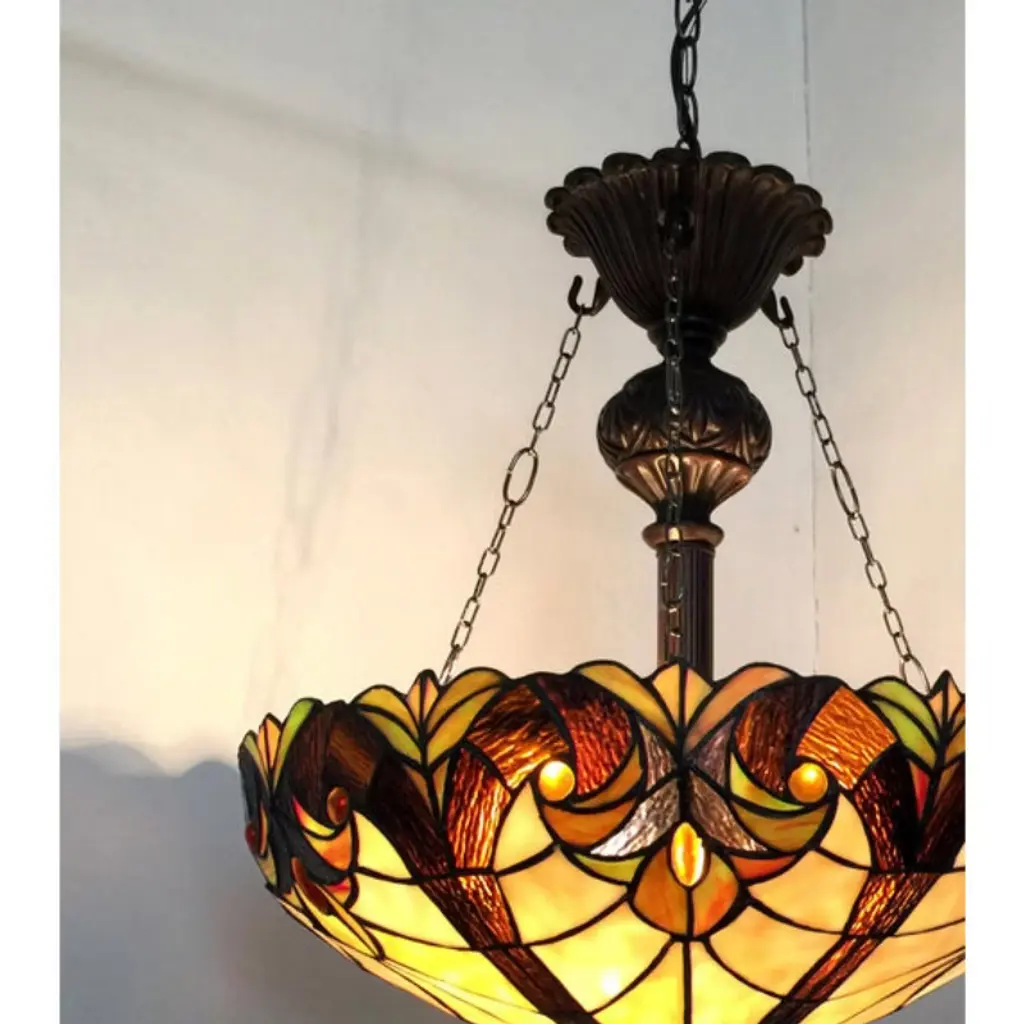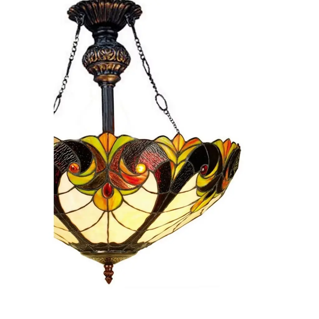 Inspired by Victorian elegance, the Liaison inverted pendant light brings timeless sophistication to your ceiling decor. Handcrafted from richly colored Tiffany-style stained glass, its intricate pattern is accentuated by jewel-like beads and a textured black finish. This uplight design gently disperses warm light upward, making it perfect for cozy dining areas, entryways, or living rooms where vintage charm is welcomed. Key Features: Victorian-inspired inverted ceiling pendant with hand-cut stained glassTextured black finish complements rich jewel tones and Victorian motifsUses (2) 100W max E26 Type A bulbs (not included), wall switch operation90" adjustable chain and wire offer versatile hanging heightsDimensions: 22"H x 18"W x 18" Projection |Weight: 11 lbs Classic Victorian form meets timeless stained-glass artistry in this handcrafted pendant.