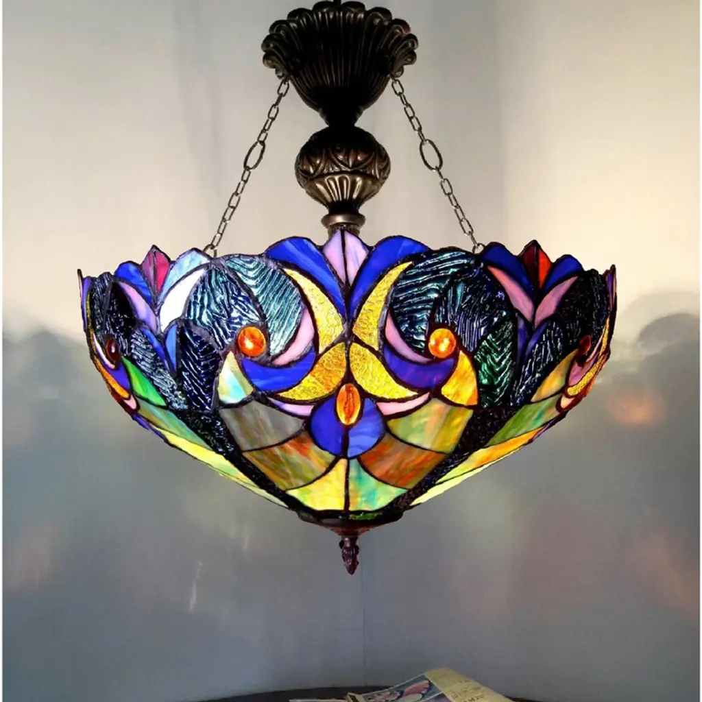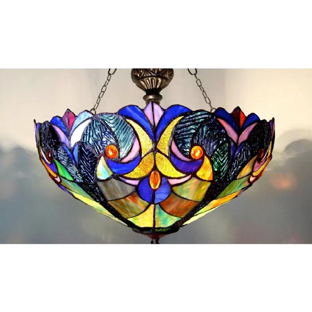 The Chloe Lighting Liaison Tiffany-style inverted ceiling pendant blends vintage elegance with timeless craftsmanship. Designed in the classic Victorian style, this 2-light fixture features a stunning 18-inch stained glass shade, hand-crafted with rich jewel tones and ornate patterns. Suspended from an antique bronze frame, the inverted bowl design casts a warm, diffused glow—perfect for dining rooms, foyers, or bedrooms. With its elegant chain-hung mount and artisan glass detailing, the Liaison pendant delivers old-world charm and functional sophistication to any traditional or classically styled space. Key features: Material: Handcrafted stained glass shade with metal hardware Color: Multicolor Tiffany-style glass with antique bronze finish Frame: Inverted bowl pendant with chain suspension Dimensions: 18-inch shade diameter; adjustable hanging length Style Match: Victorian, traditional, and vintage-inspired interiors