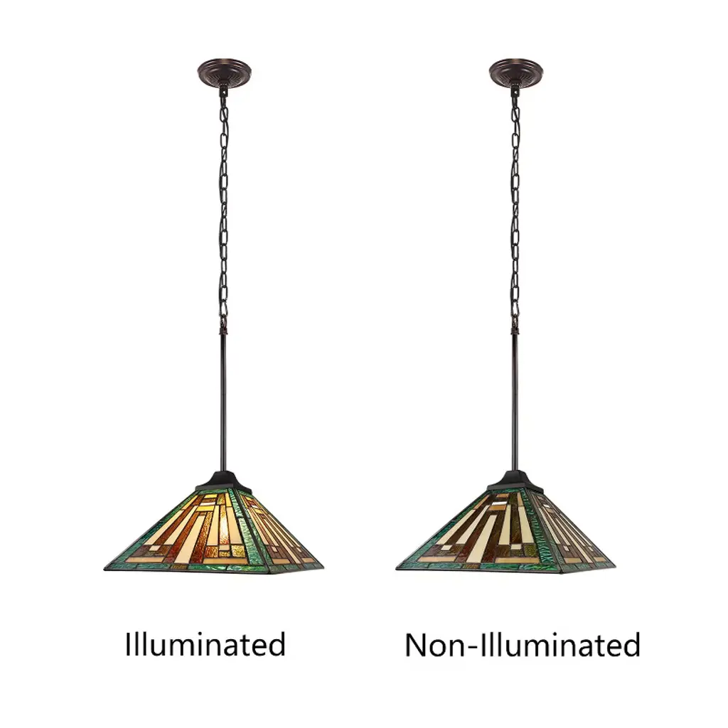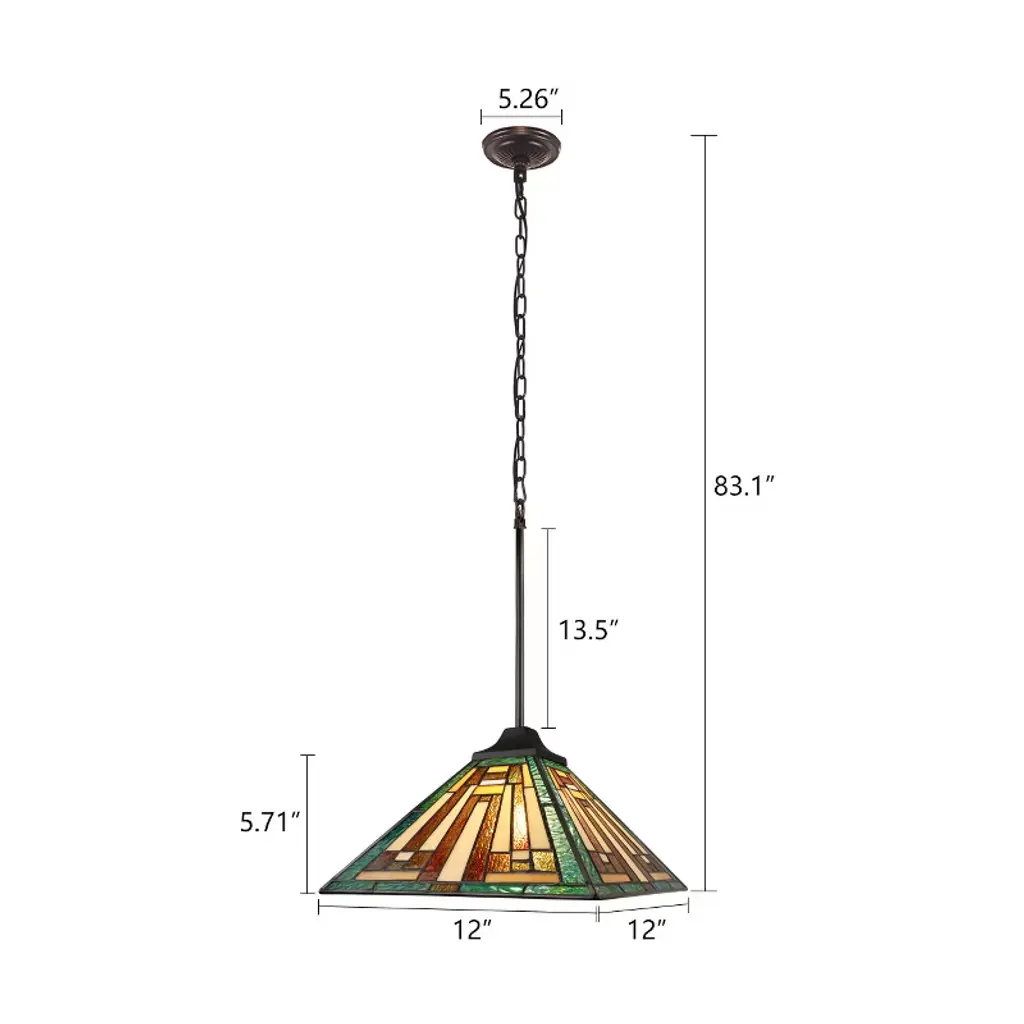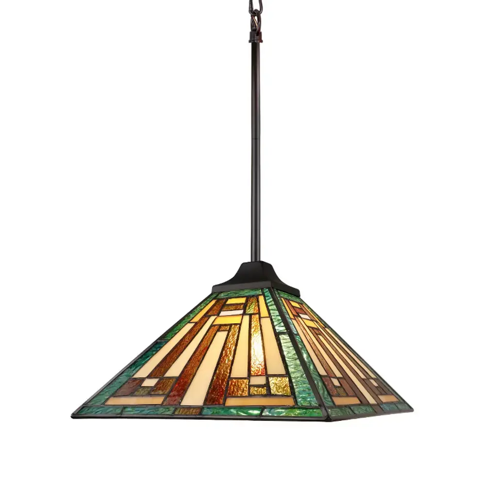 Firman is a stunning 1 light ceiling pendant, featuring a beautiful mission shade. This piece would be perfect in a hallway or even over a bed frame. Each shade is handcrafted, using the same methods developed by Louis Comfort Tiffany in the early 1900's. This process entails using 152 hand cut stained art glass pieces, each wrapped in fine copper foil and soldered together at extremely high temperatures to form each unique piece. Exact size to the nearest inch may vary, and exact color of each glass piece may vary due to each piece being handcrafted. First image is with the light shining through, second image is with no light. Dry listed and recommended for an indoor setting.