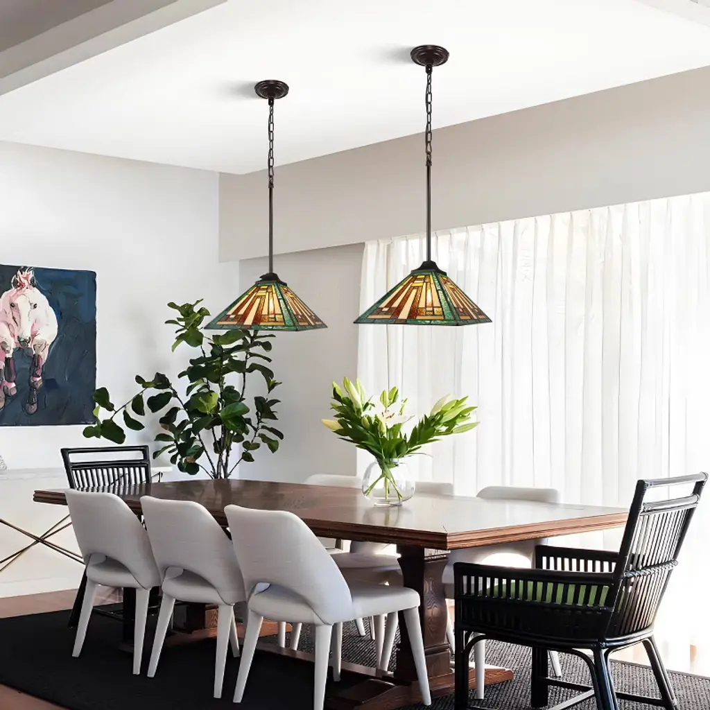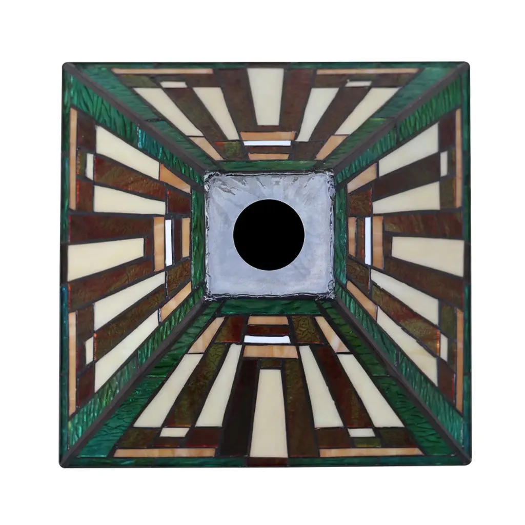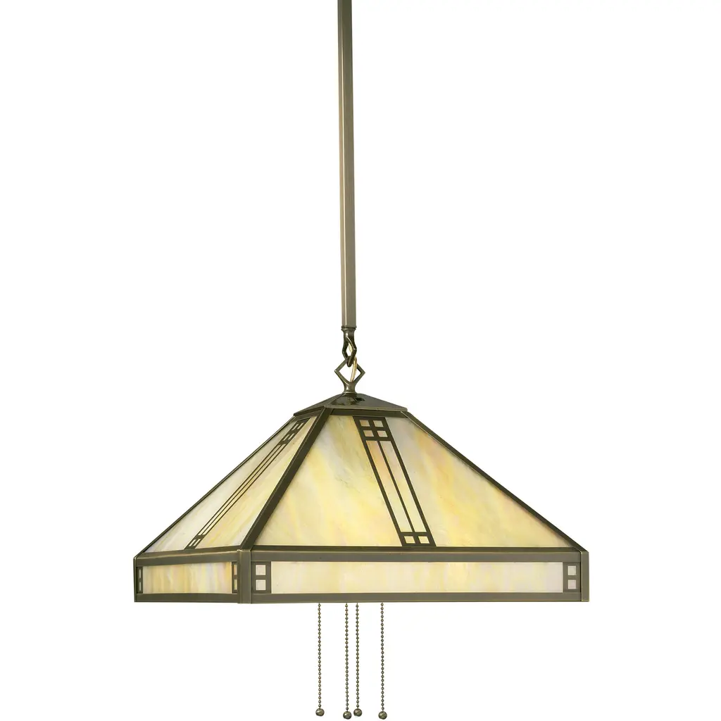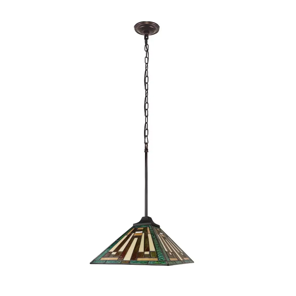 Firman is a stunning 1 light ceiling pendant, featuring a beautiful mission shade. This piece would be perfect in a hallway or even over a bed frame. Each shade is handcrafted, using the same methods developed by Louis Comfort Tiffany in the early 1900's. This process entails using 152 hand cut stained art glass pieces, each wrapped in fine copper foil and soldered together at extremely high temperatures to form each unique piece. Exact size to the nearest inch may vary, and exact color of each glass piece may vary due to each piece being handcrafted. First image is with the light shining through, second image is with no light. Dry listed and recommended for an indoor setting.