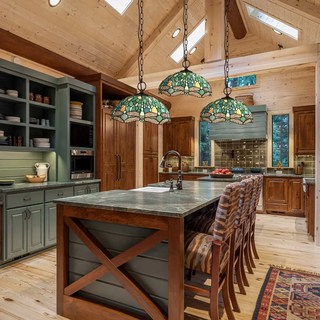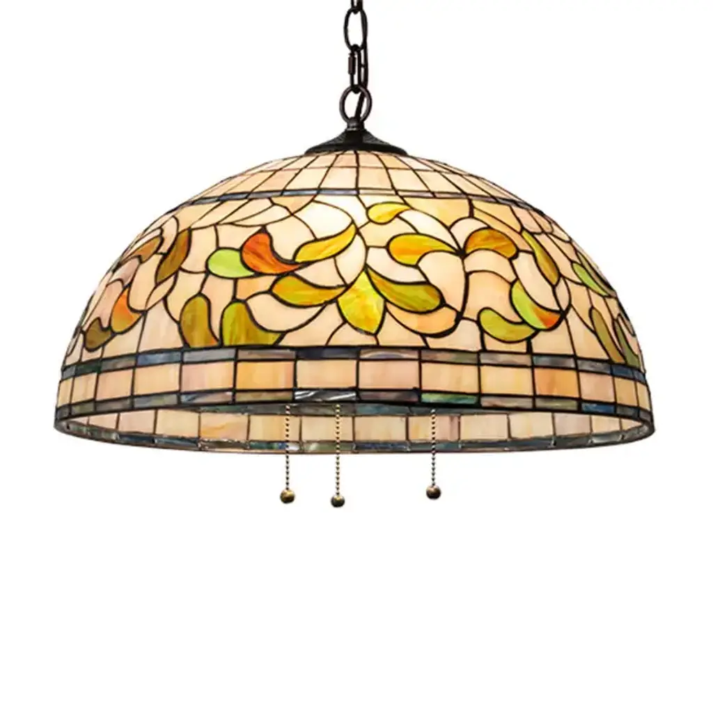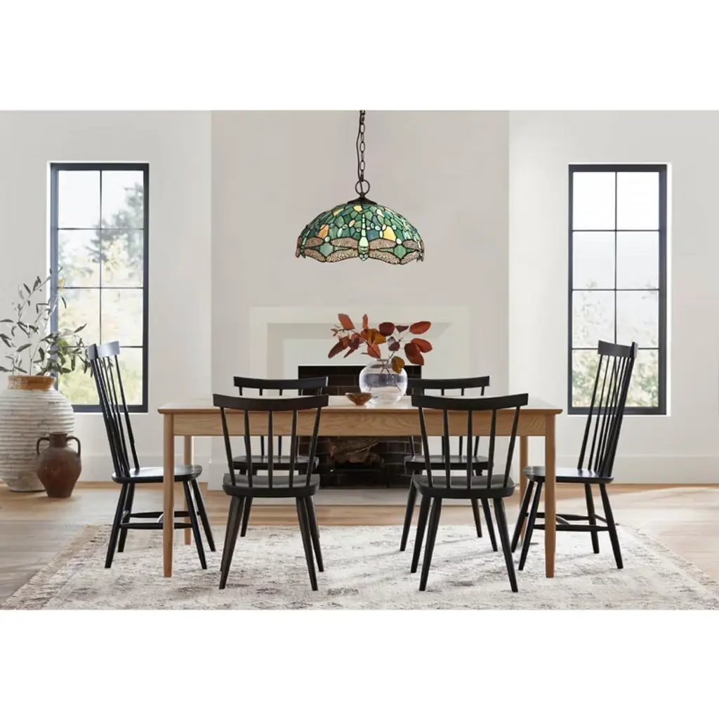 Sunniva is a stunning 2 light ceiling pendant, featuring a beautiful dragonfly shade. This piece would be perfect in a hallway or even over a bed frame. Each shade is handcrafted, using the same methods developed by Louis Comfort Tiffany in the early 1900's. This process entails using 252 hand cut stained art glass pieces, and 96 glass beads, each wrapped in fine copper foil and soldered together at extremely high temperatures to form each unique piece. Exact size to the nearest inch may vary, and exact color of each glass piece may vary due to each piece being handcrafted. First image is with the light shining through, second image is with no light. Dry listed and recommended for an indoor setting.