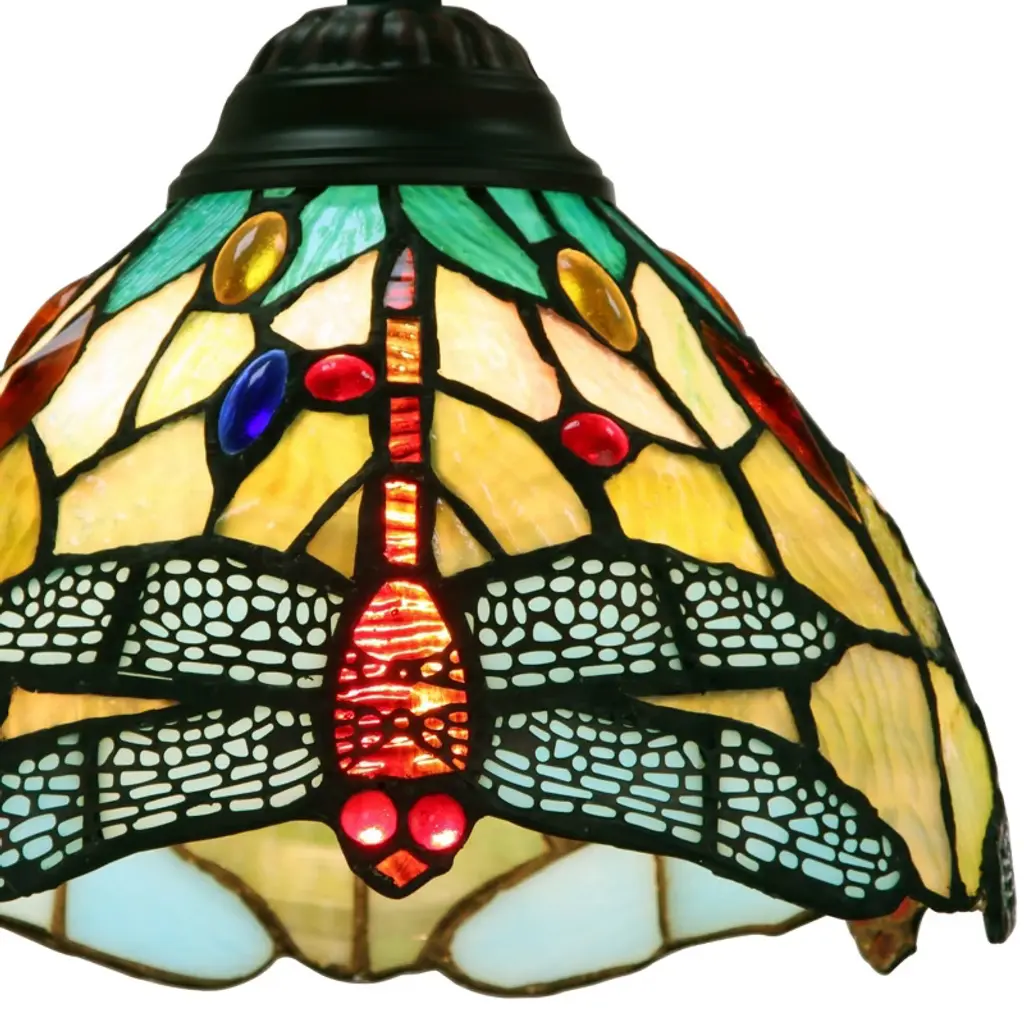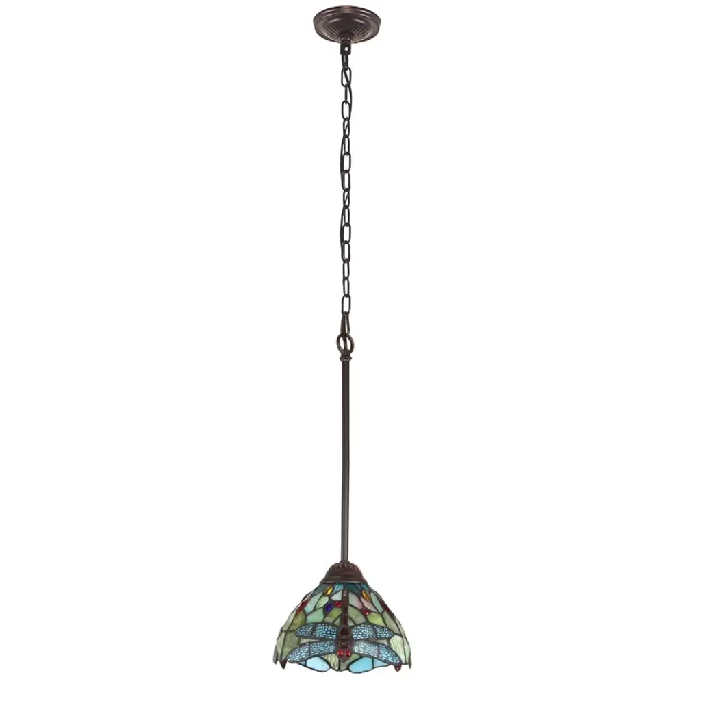EMPRESS, a 1-light Dragonfly hanging pendant lamp, will make a design statement by itself. Expand the effect by adding one or more of the other lamps in this design style. Each of CHLOE`s Tiffany-style stained glass shades are formed using the very same techninique developed by Louis Comfort Tiffany in the early 1900`s, using hand cut stained art glass, each wrapped in fine copper foil and soldered together at extremely high temperatures to form each unique shade. Exact size to the nearest inch may vary, and exact color of each glass piece may vary due to each piece being hand crafted. First image is with the light on, second image is with the light off. The fixture takes one 100W E26 bulb and is compatible with incandescent, flourescent, and LED bulbs. This fixture is UL listed, and dry listed for indoor use. Also, this sconce is recommended for both residential and non-residential use!