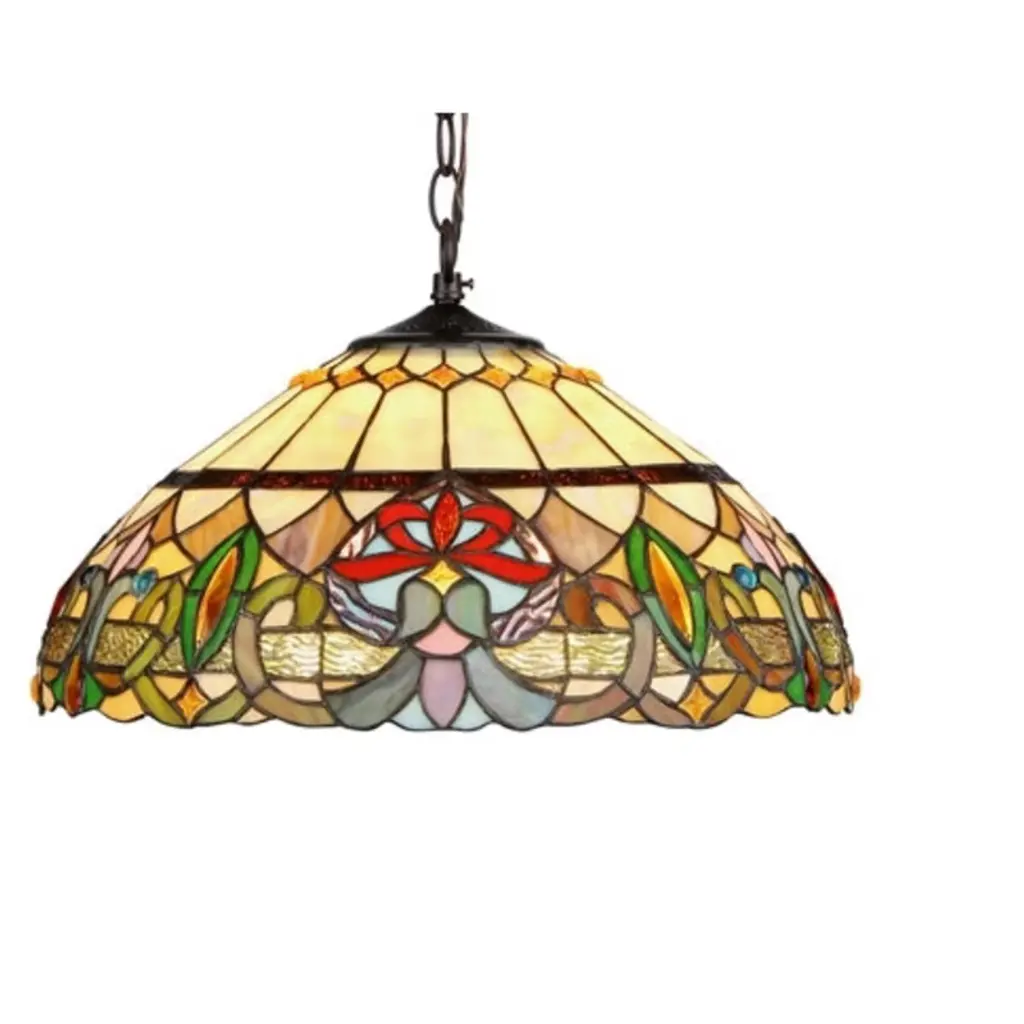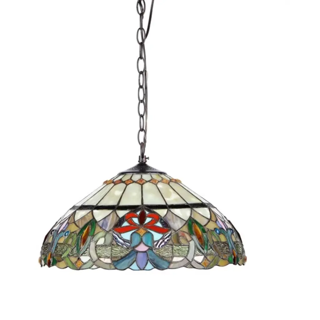 Elevate your interior with the timeless elegance of the Hester Victorian Pendant Light. Featuring a rich Tiffany-glass shade crafted from 438 hand-cut glass pieces and accented with six jewel-like beads, this ceiling pendant brings warm, multicolored ambiance to your room. The deep antique bronze finish adds vintage flair, while the generous 84-inch wire and chain offer flexible hanging height for any ceiling type. Ideal for dining areas, foyers, or bedrooms, this handcrafted piece blends artistry with illumination. Key Features: Elegant Victorian pendant light with richly colored Tiffany-style glass Hand-assembled using traditional copper foil technique with 438 cuts and 6 beads Antique bronze finish adds a touch of old-world charm to any room Dimensions: 9.1" H × 17.7" W | Shade: 18" round | Net weight: 7.47 lbs UL and cUL Listed; Proposition 65 compliant for safe indoor installation