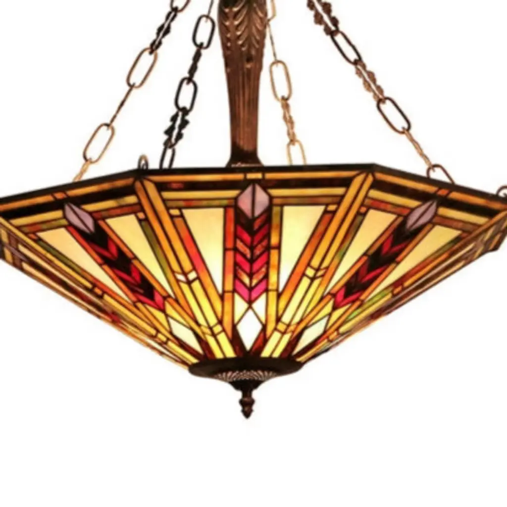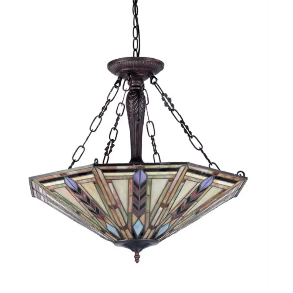 Make a bold statement with the Chloe Lighting JAYDEN Tiffany-Style 3-Light Inverted Ceiling Pendant Fixture, featuring a substantial 25-inch stained glass shade. Handcrafted using the copper foil technique, this Mission-style pendant showcases geometric patterns in warm amber, cream, and brown tones. Its inverted bowl design casts a soft, diffused glow, ideal for dining rooms, foyers, or large living spaces. Supported by a bronze-finished metal frame, this fixture combines timeless artistry with modern functionality—perfect for adding handcrafted warmth and architectural elegance to your decor. Product Overview: Design: Mission-style inverted pendant with a handcrafted stained glass shade featuring earthy tones.Finish: Antique bronze patina.Dimensions: Approximately 22.87 inches (H) x 24.8 inches (W) x 24.8 inches (D).Weight: 12.6 lbs.Material: Glass shade with a metal frame.Bulb Requirements: 3 x 100W E26 medium base bulbs (not included).Installation: Hardwired; no switch on the fixture.Certifications: UL listed for safety.Style: Ideal for traditional, Craftsman, or rustic interiors.
