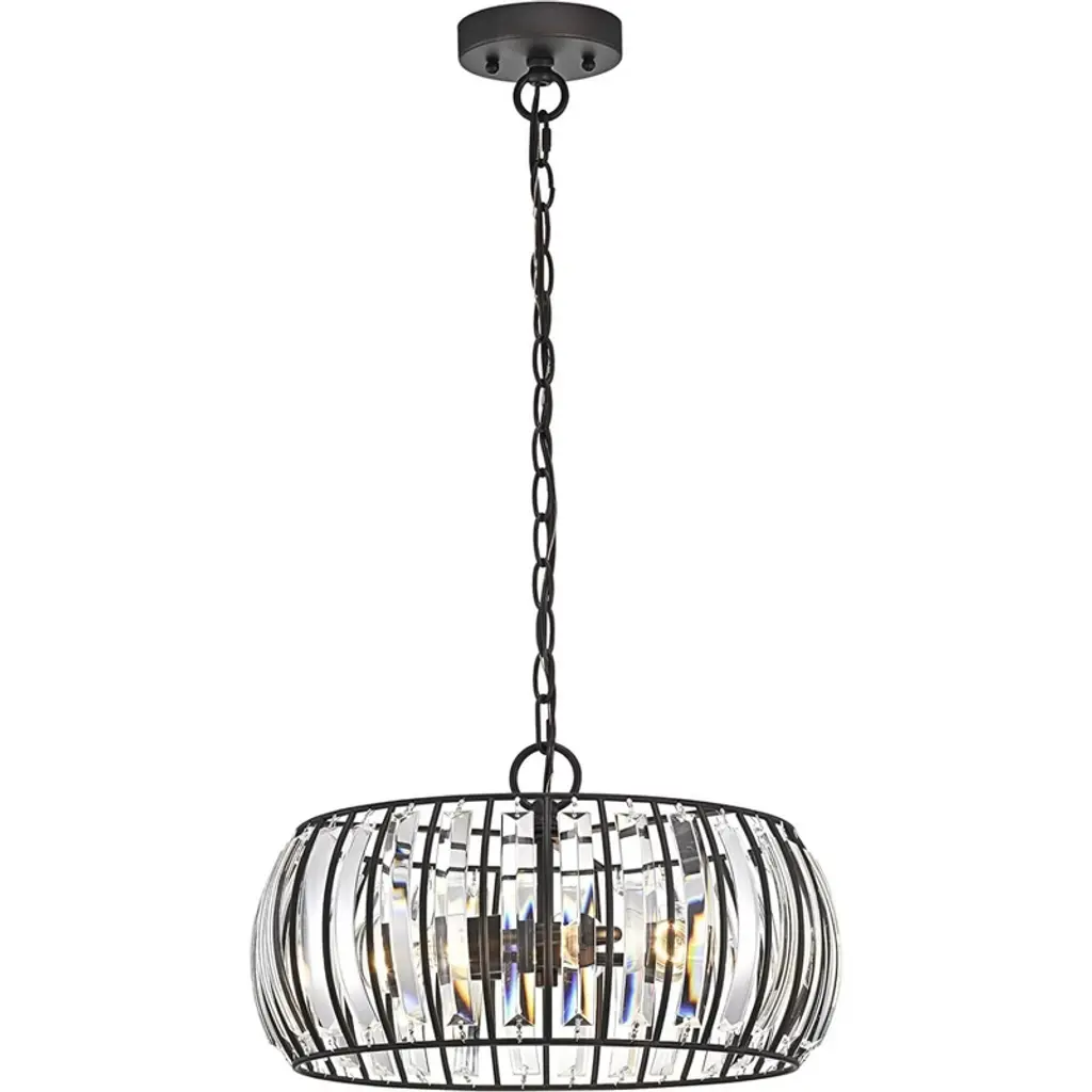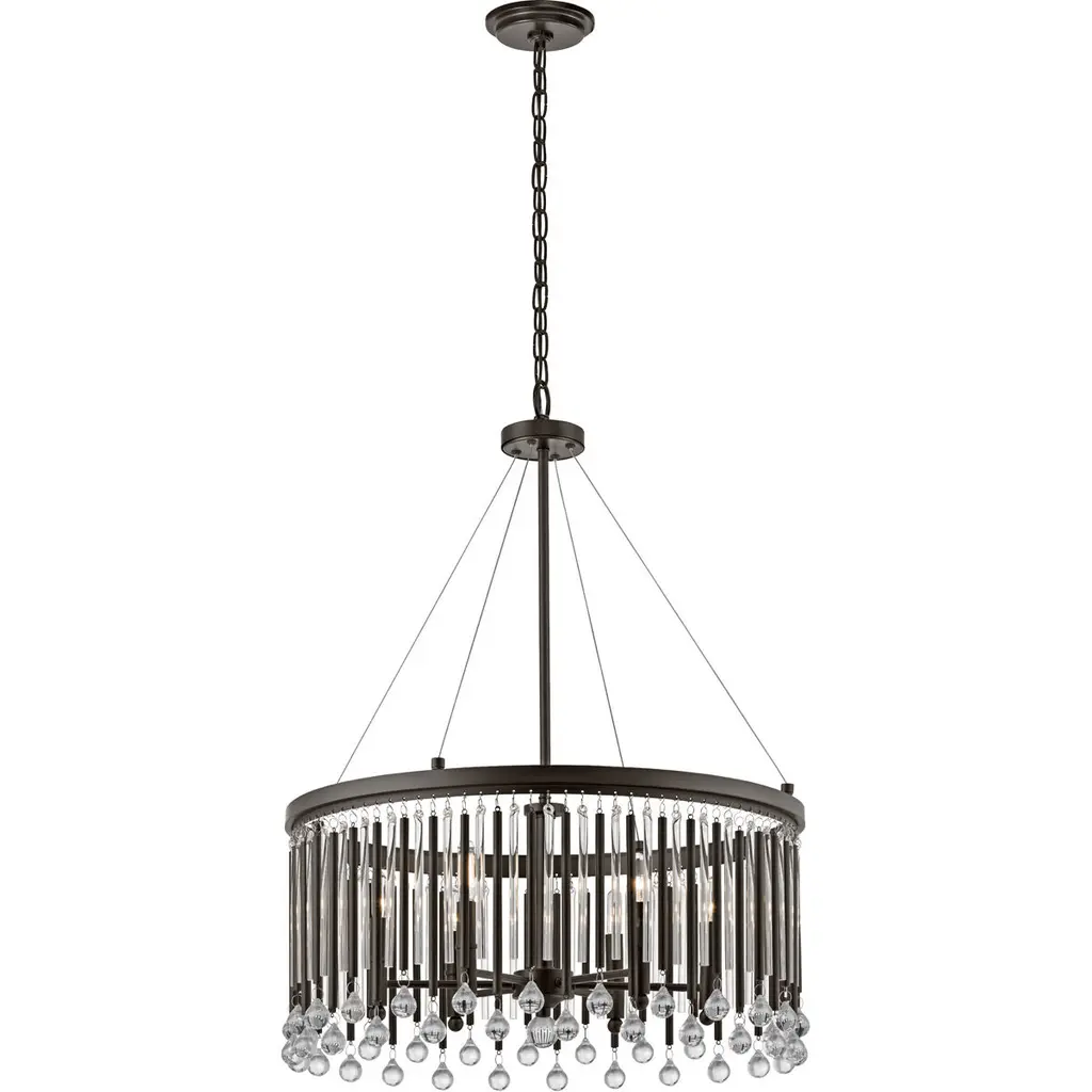Upgrade your living aread with this beautifully designed hanging pendant! This pendant features a horizontal over shaped shade, outlined with multiple strips of crystal glass. This rubbed bronze fixture would be wonderful to place in an entry way or dining room. The fixture takes five 100W bulbs with E26 bases. This fixture is only dry approved for indoors.