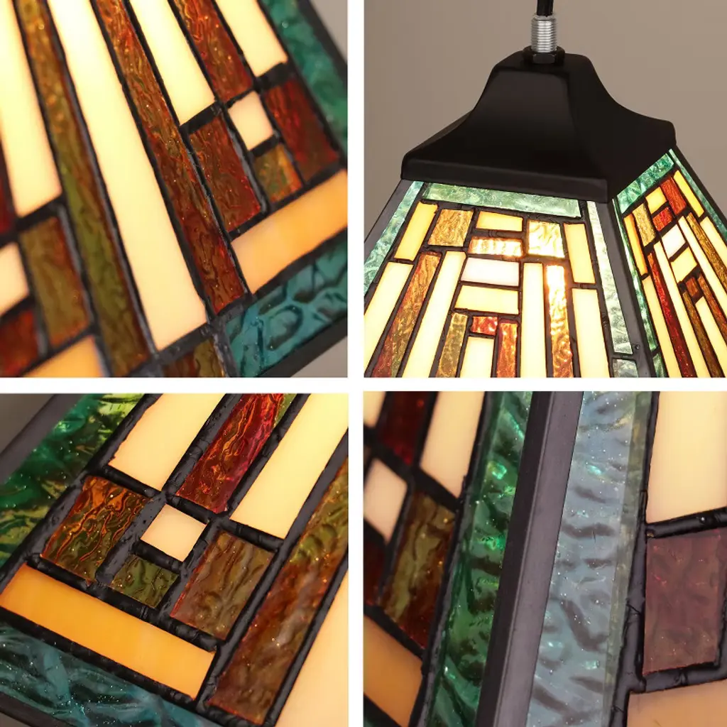 Firman is a stunning 1 light ceiling pendant, featuring a beautiful mission shade. This piece would be perfect in a hallway or even over a bed frame. Each shade is handcrafted, using the same methods developed by Louis Comfort Tiffany in the early 1900's. This process entails using 144 hand cut stained art glass pieces, each wrapped in fine copper foil and soldered together at extremely high temperatures to form each unique piece. Exact size to the nearest inch may vary, and exact color of each glass piece may vary due to each piece being handcrafted. First image is with the light shining through, second image is with no light. Dry listed and recommended for an indoor setting.