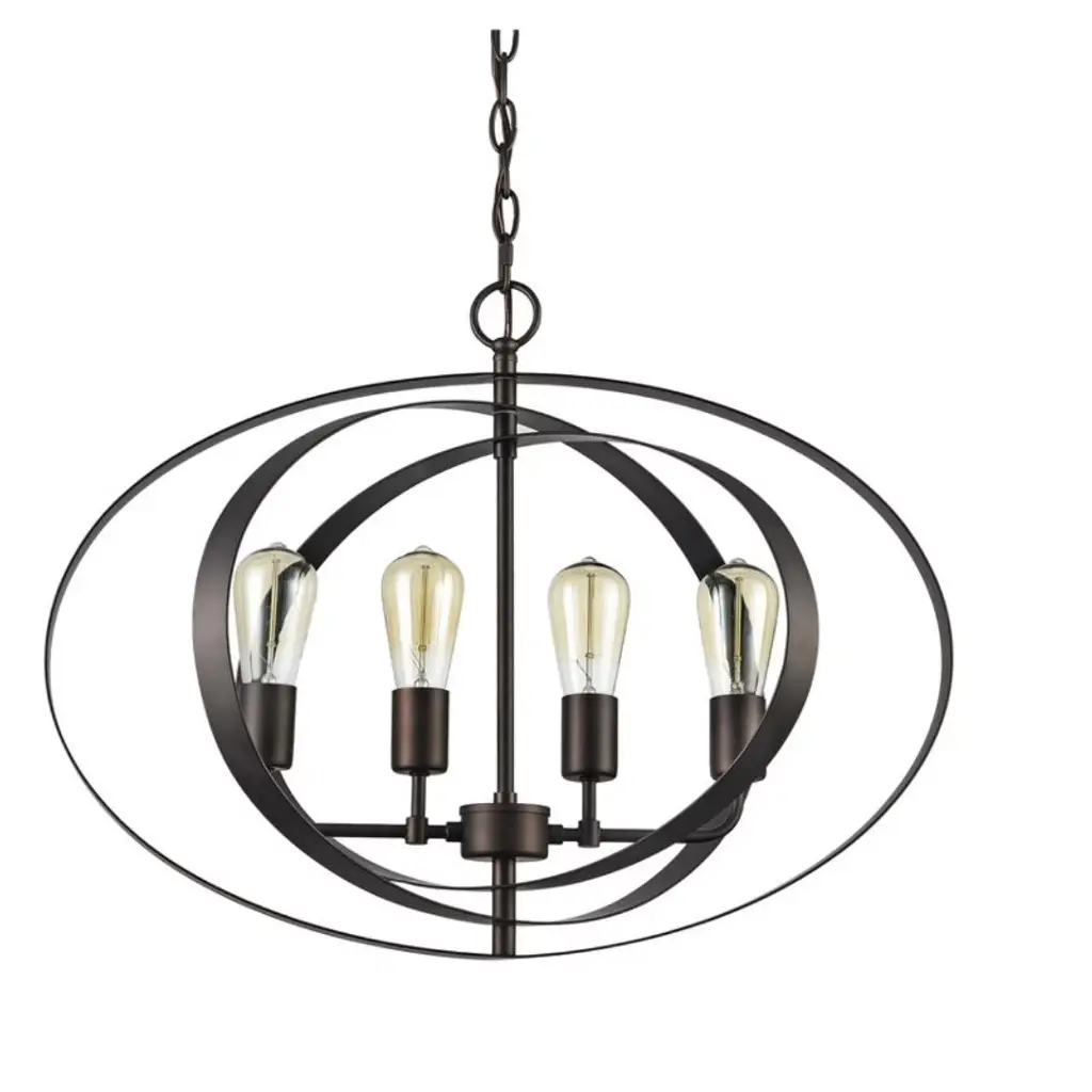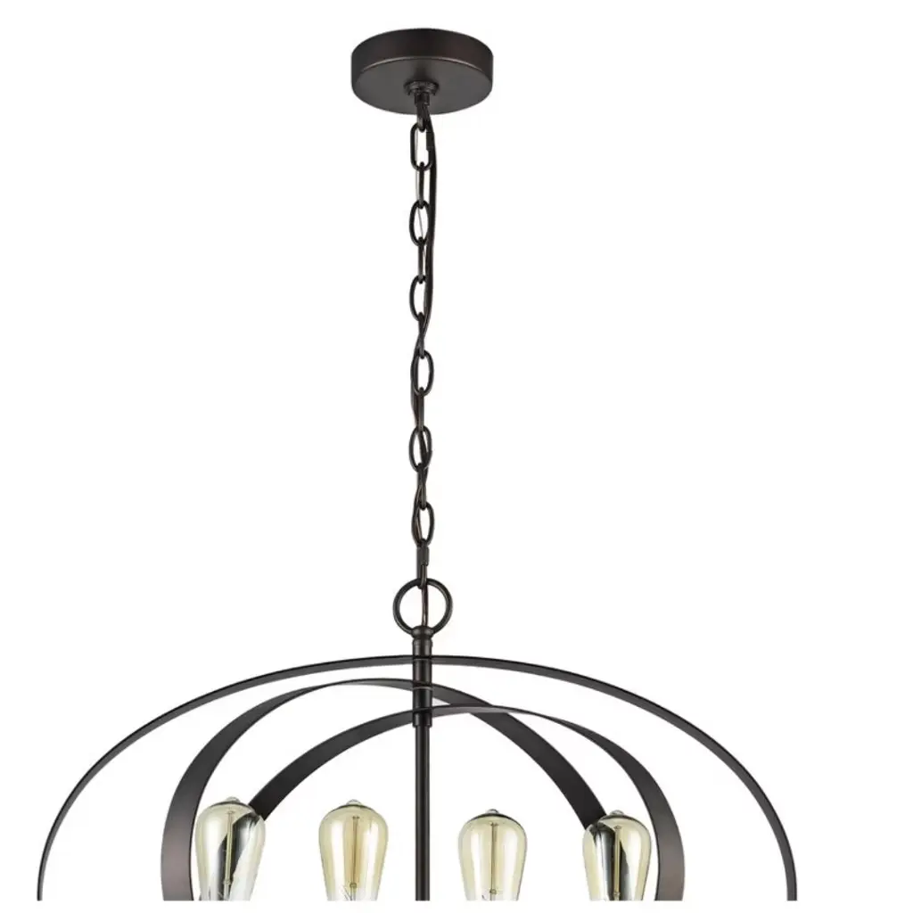 Make a bold statement in your space with the Osbert 4-Light Ceiling Pendant, a striking blend of industrial edge and architectural design. Finished in oil rubbed bronze, this pendant showcases a structured steel frame and open-cage design that allows ambient light to fill the room with warm, welcoming character. Ideal for dining rooms, lofts, or entryways seeking a modern industrial twist. Key Features: Requires (4) 100W max E26 Type A bulbs (not included) for ample illumination Oil rubbed bronze finish offers rugged sophistication Open steel framework adds visual depth and modern industrial appeal Hardwired with wall switch for reliable control Dimensions: 24" W x 18.5" H | Includes 96" adjustable chain & wire | Net weight: 8.25 lbs