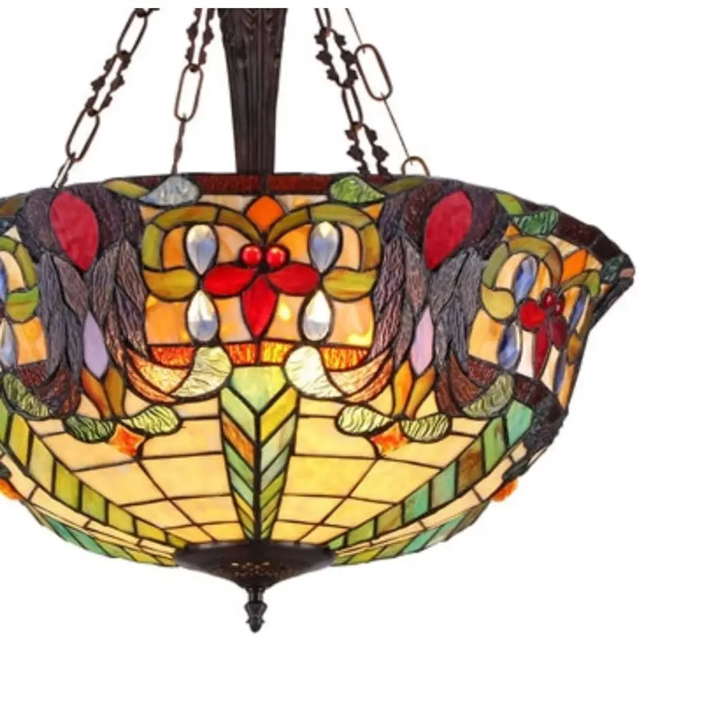 Bring timeless elegance to your interiors with the RILEY inverted ceiling pendant. A tribute to Victorian artistry, its scalloped-edge shade features blooming floral patterns, highlighted with shimmering cabochons and delicate crystals. Expertly handcrafted from 570 pieces of stained glass, each section is joined using the traditional copper foil technique. Suspended from a 73" adjustable chain, the warm antique bronze finish adds old-world charm to living rooms, dining areas, or foyers. Key Features: Beautiful inverted design creates an elegant focal pointMade with 570 hand-cut stained glass pieces, 12 beads, and crystals3-light configuration for ample downlight ambianceFinished in antique bronze with high-quality resin and metal frameDimensions: 22"W x 24.6"H | Shade Height: 9.06" |Net Weight: 14.1 lbs A sophisticated lighting centerpiece that offers dazzling detail, warm illumination, and timeless Victorian style.