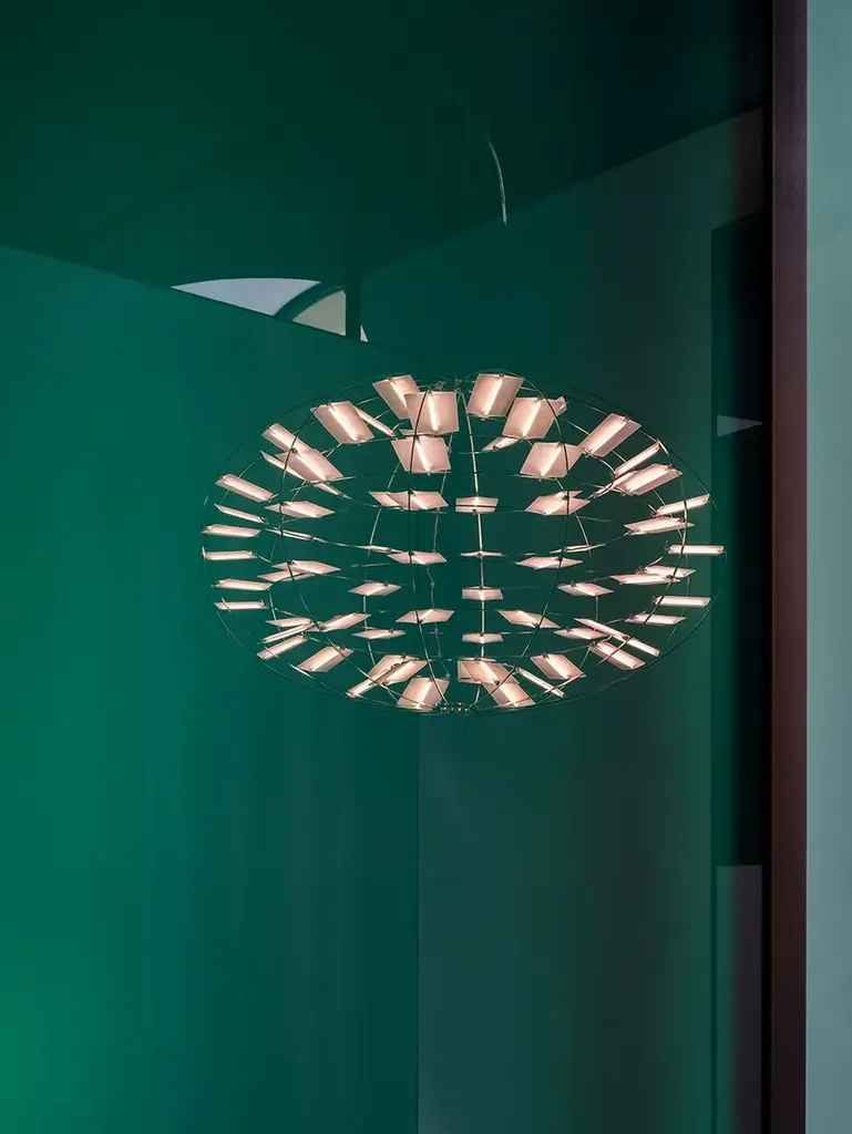 Chloris is an aluminum pendant lamp.Comprehension and prediction of future technologies are the driving themes behind Chloris, a two-year research project by Arihiro Miyake. A pendant lamp which explores the paradigm of atmospheric design. Framed by a conducting structure, single LED sources are embedded in polycarbonate diffusers, dispersing in the air like floating.Source: LED boardTotal power: 90WEmission: diffusedColor temperature: 2500K / 3000KTension: 110-240VIP class: 20Cable length 2,5m