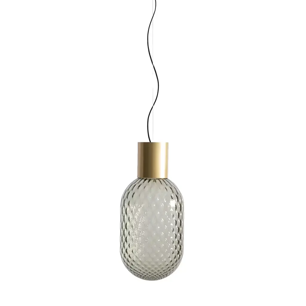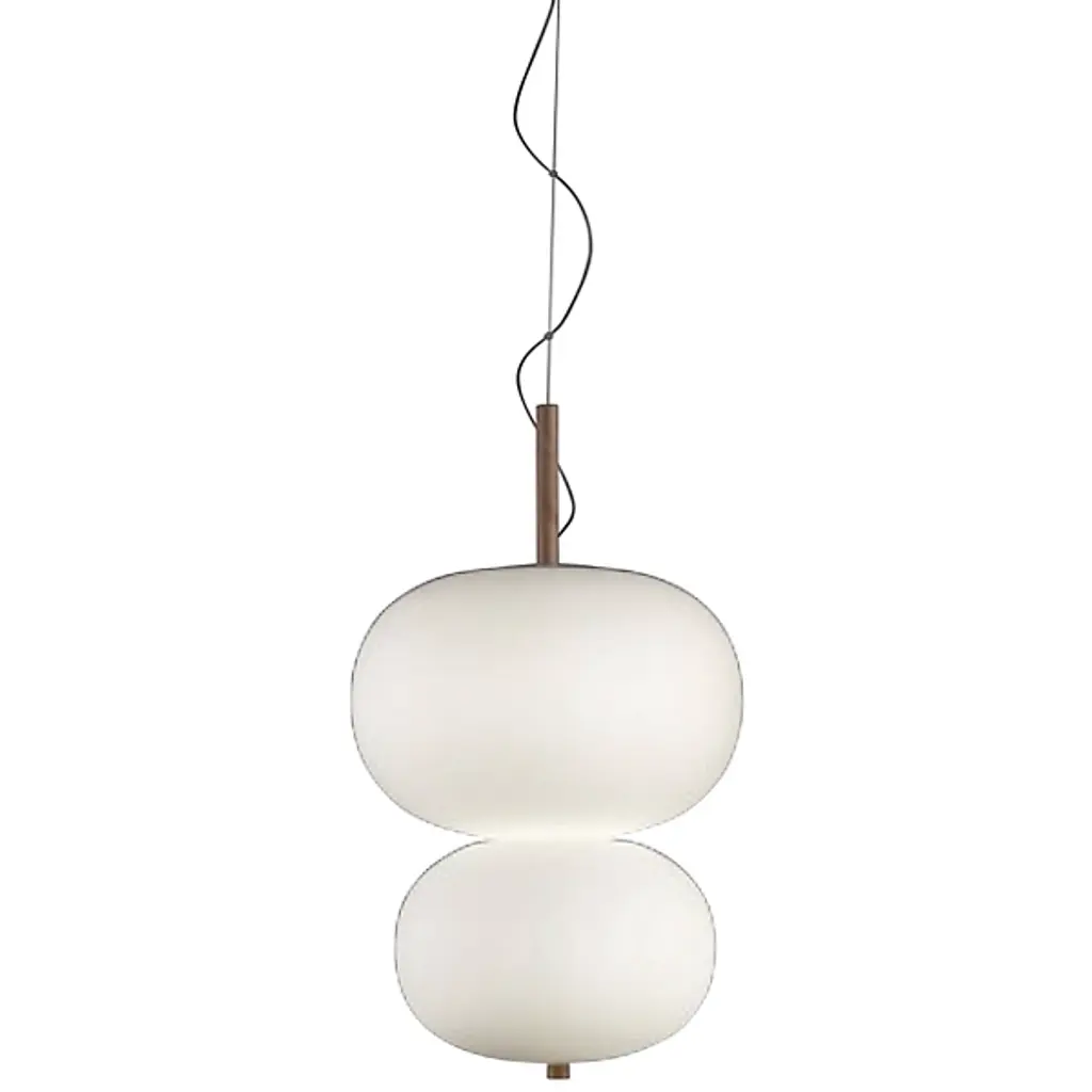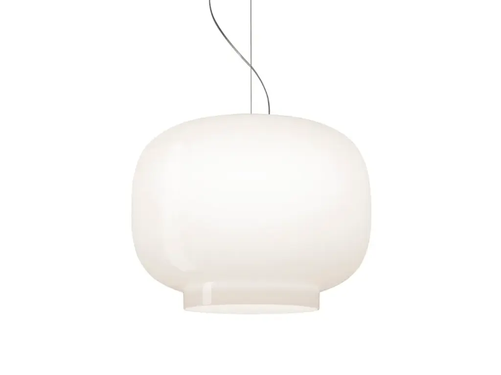 Chouchin 1 is a lacquered blow glass pendant lamp.LIGHT SOURCEChouchin 1 220 / 240 VLED retrofit included21W E272700 K 2500 lm CRI>80Dimmable with TRIAC technology AppIP 20Chouchin 1 LED220 / 240 VLED retrofit included24W COB2700 K 2581 lm CRI>90DimmableOn-Off/Push/DALIIP 20Energy efficiency EA reminder of typical Japanese lanterns, in a contemporary reinterpretation. The three coordinated models play with the contrast between glossy coated blown glass – in warm, creamy colours impermeable to light – and the white lower portion that glows, spreading light downward.