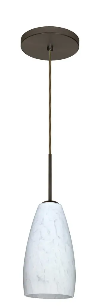 The Chrissy pendant features a softly radiused glass, that will gracefully blend into almost any decorating theme. Our Carrera glass is a classic yet modern décor that gives off a soft white light. Clear molten glass is rolled in alabaster powder like frit, and then blown into shape with a semi-clear frosted white inner finish. This décor is created by rolling molten glass in small bits of white called frit. The smooth satin finish on the clear outer layer is a result of an extensive etching process. This blown glass is handcrafted by a skilled artisan, utilizing century-old techniques passed down from generation to generation. Each piece of this décor has its own artistic nature that can be individually appreciated. The cord pendant fixture is equipped with a 10' SVT cordset and a low Profile flat monopoint canopy. These stylish and functional luminaries are offered in a beautiful brushed Bronze finish.