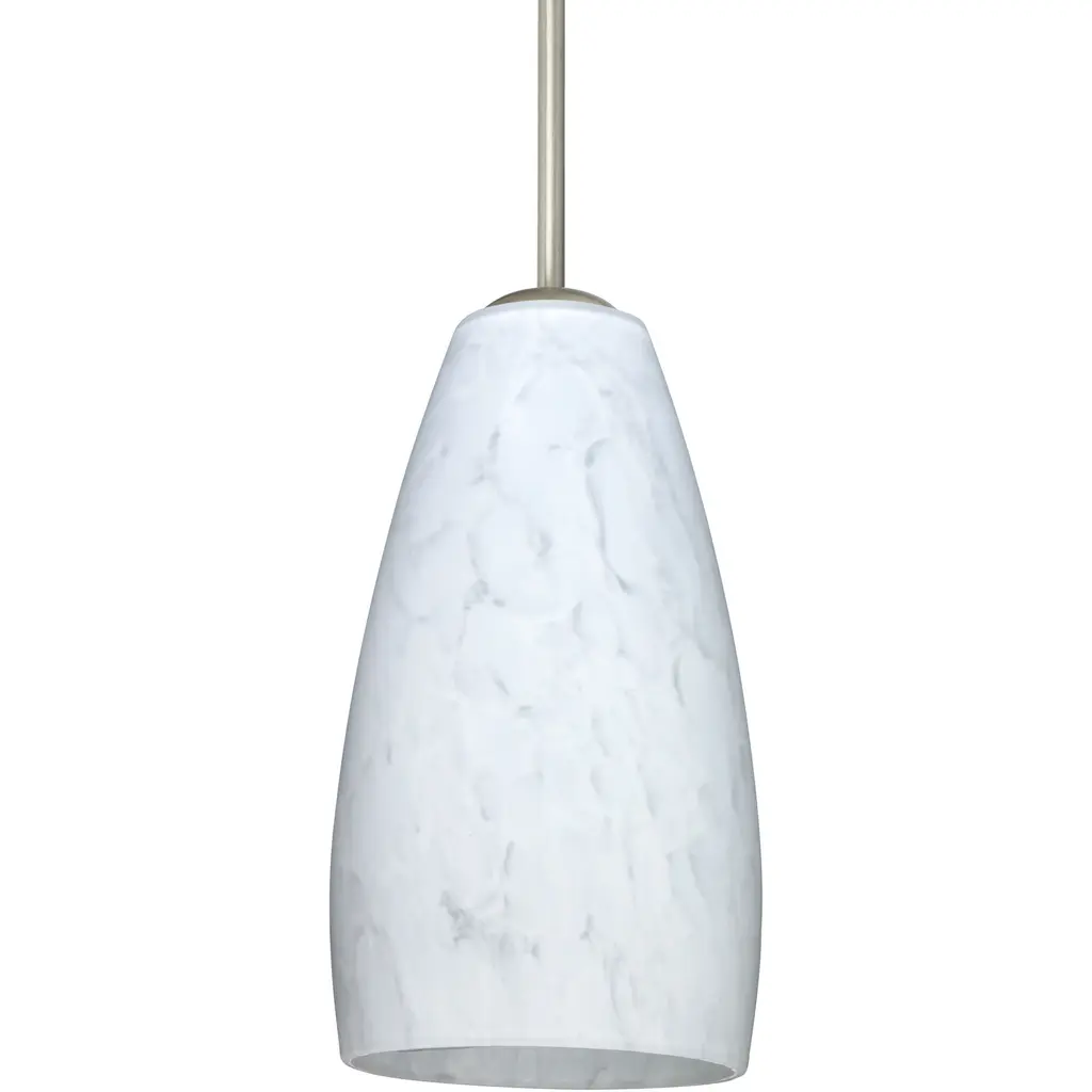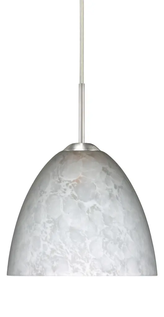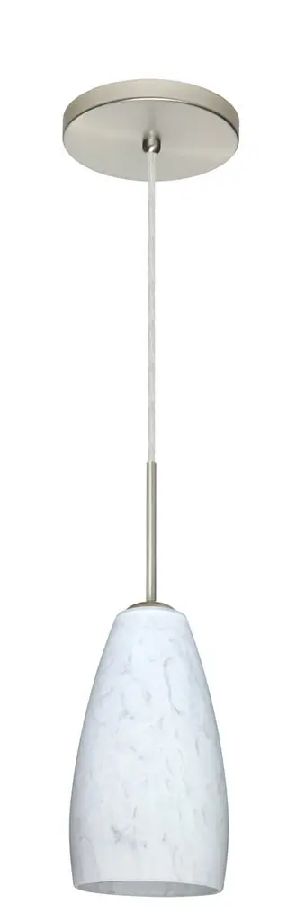 The Chrissy pendant features a softly radiused glass, that will gracefully blend into almost any decorating theme. Our Carrera glass is a classic yet modern décor that gives off a soft white light. Clear molten glass is rolled in alabaster powder like frit, and then blown into shape with a semi-clear frosted white inner finish. This décor is created by rolling molten glass in small bits of white called frit. The smooth satin finish on the clear outer layer is a result of an extensive etching process. This blown glass is handcrafted by a skilled artisan, utilizing century-old techniques passed down from generation to generation. Each piece of this décor has its own artistic nature that can be individually appreciated. The cord pendant fixture is equipped with a 10' SVT cordset and a low Profile flat monopoint canopy. These stylish and functional luminaries are offered in a beautiful Satin Nickel finish.