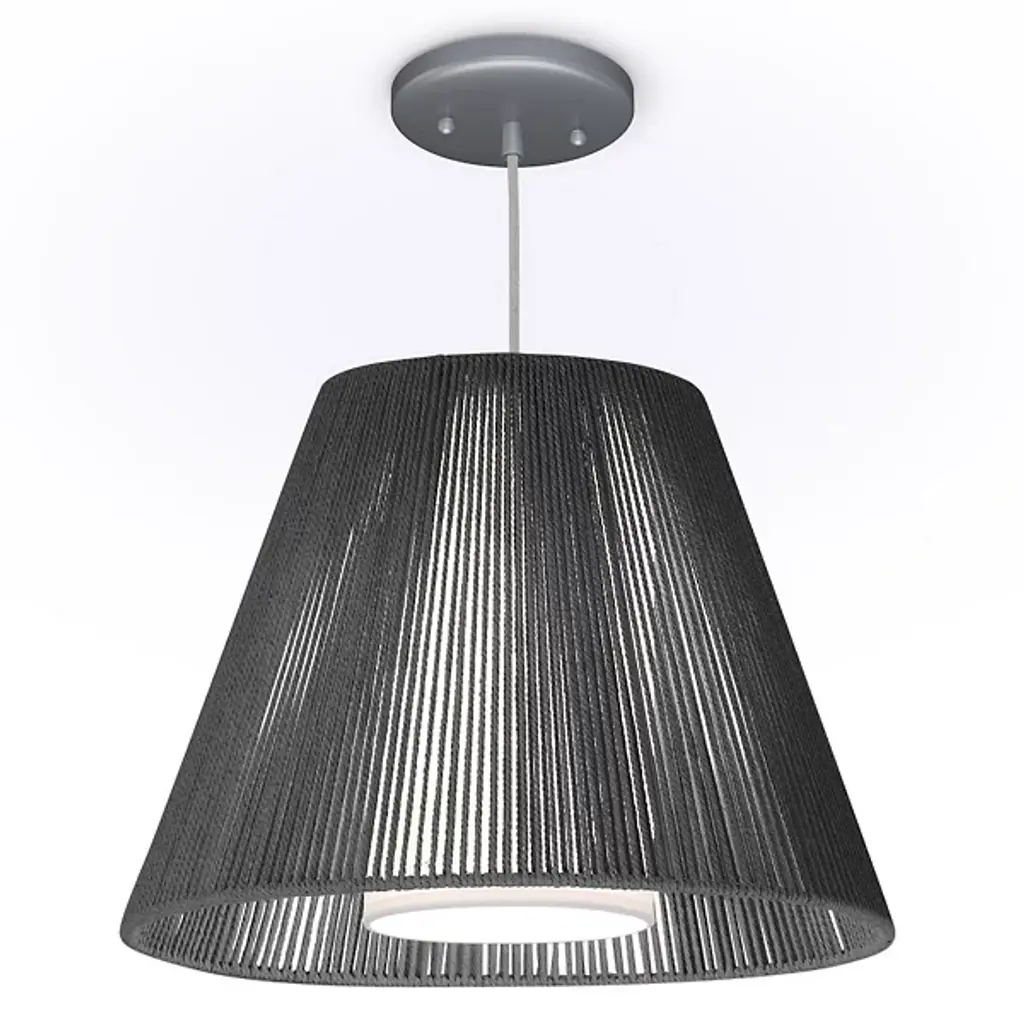 The Christina Pendant from Seascape Lamps balances an open, layered structure with fine details. The design is made in California, and suspends from a central cord, its conical frame wrapped in vertical bands of cotton yarn that add rustic texture. A cylindrical diffuser inside surrounds the lamp, softening efficient illumination into a steady glow. As light passes through the layered surfaces, it spreads evenly outward and casts subtle warmth through the yarn, uniting simple geometry with fine artisanal materials.