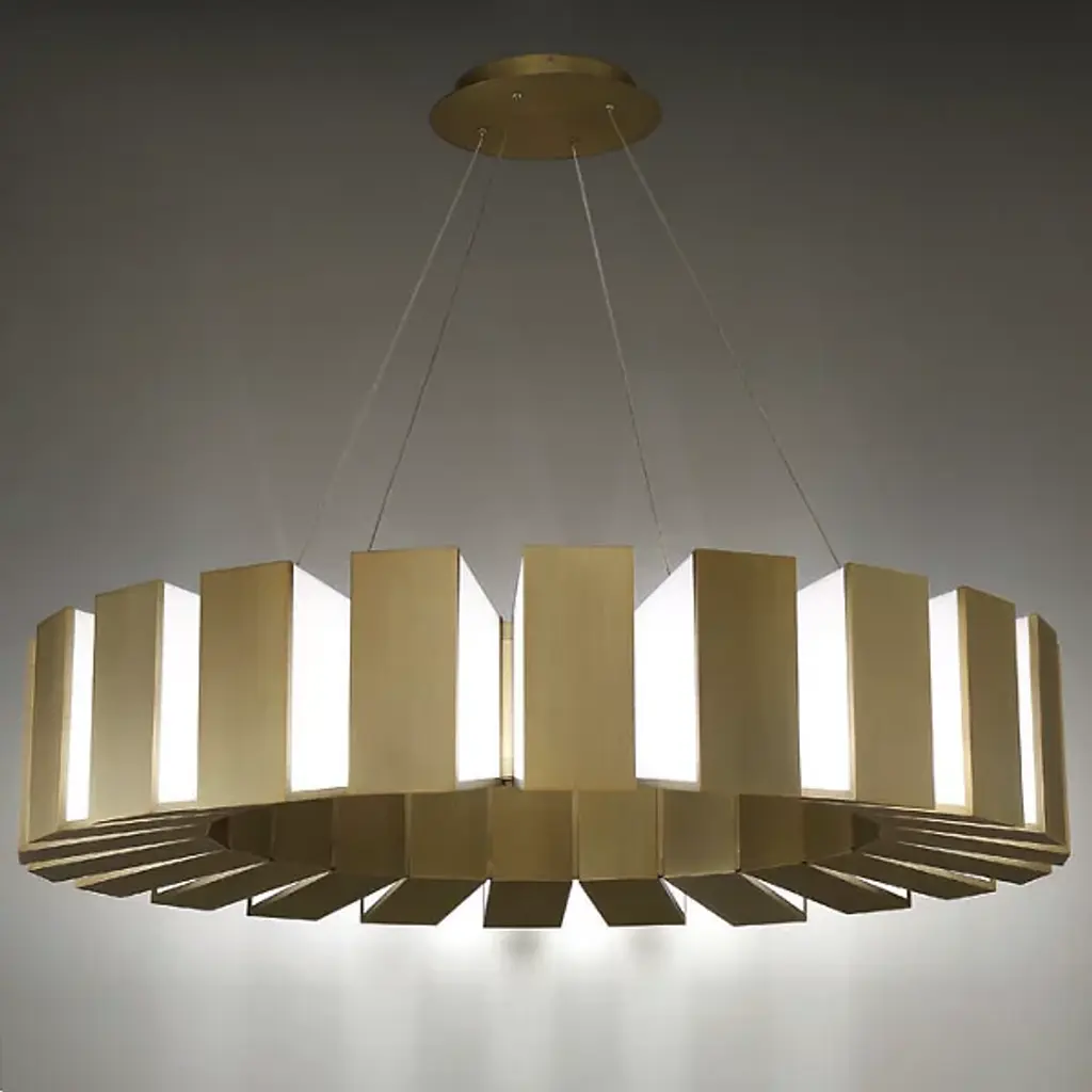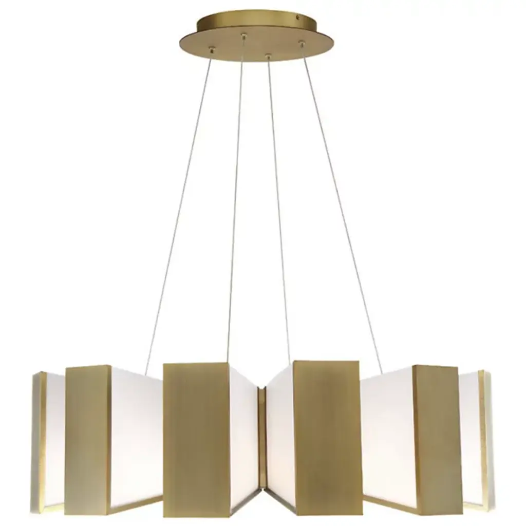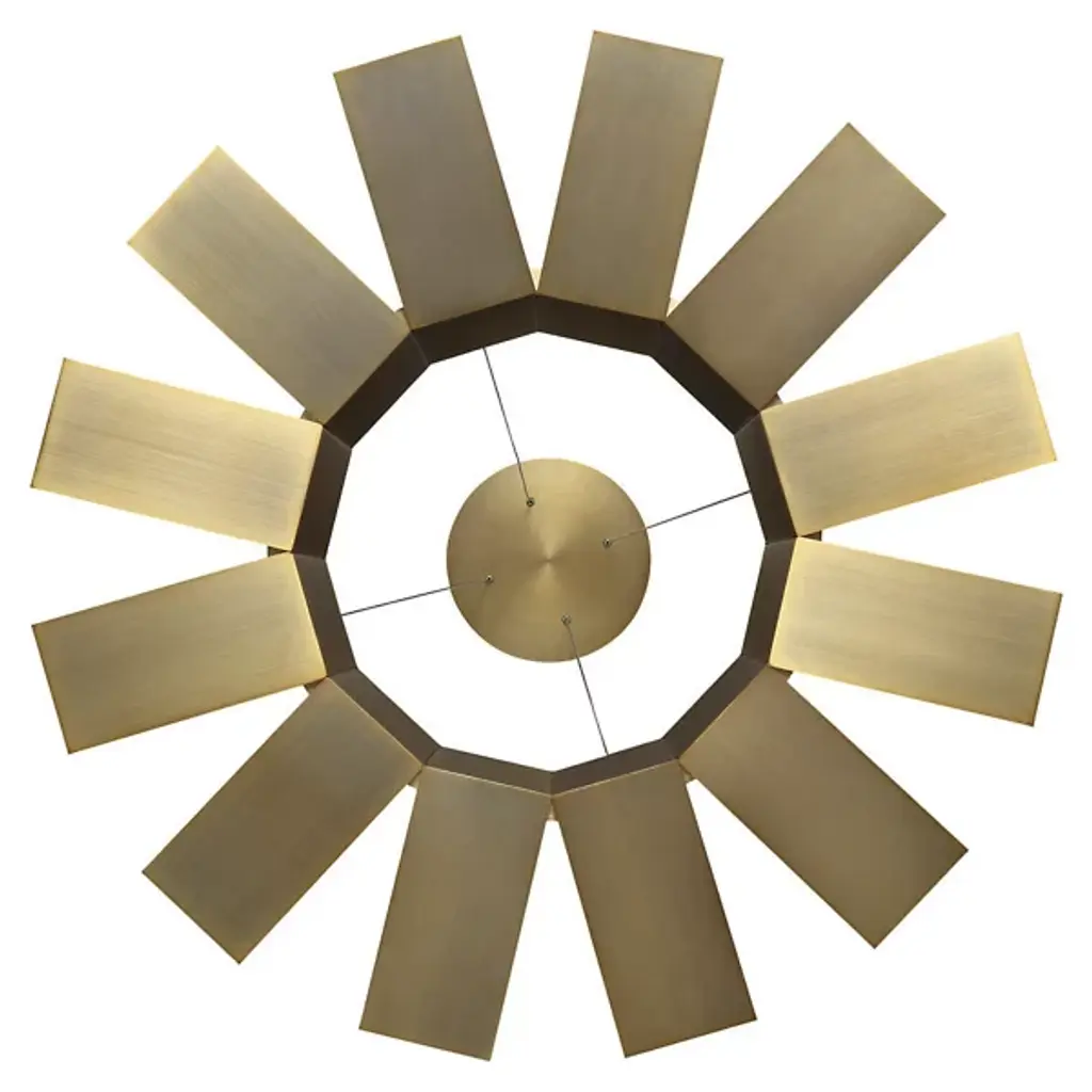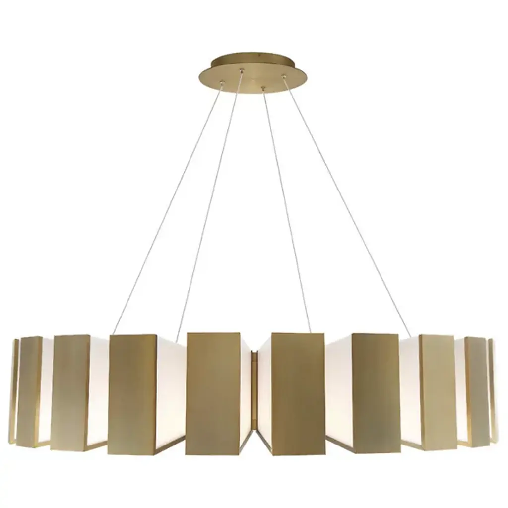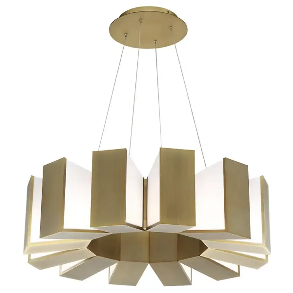 Showcasing a fanning display of illumination, the Chronos LED Pendant by Modern Forms is reminiscent of gears inside a giant clock. Each rectangular bar consists of an Aged Brass-front and Acrylic side panels, reflecting and refracting light from integrated LEDs in a dynamic indirect fashion. Suspends from a round matching canopy with slender cords, contrasting levity with the fixture's rugged, mechanistic presence, creating a visually appealing aesthetic.