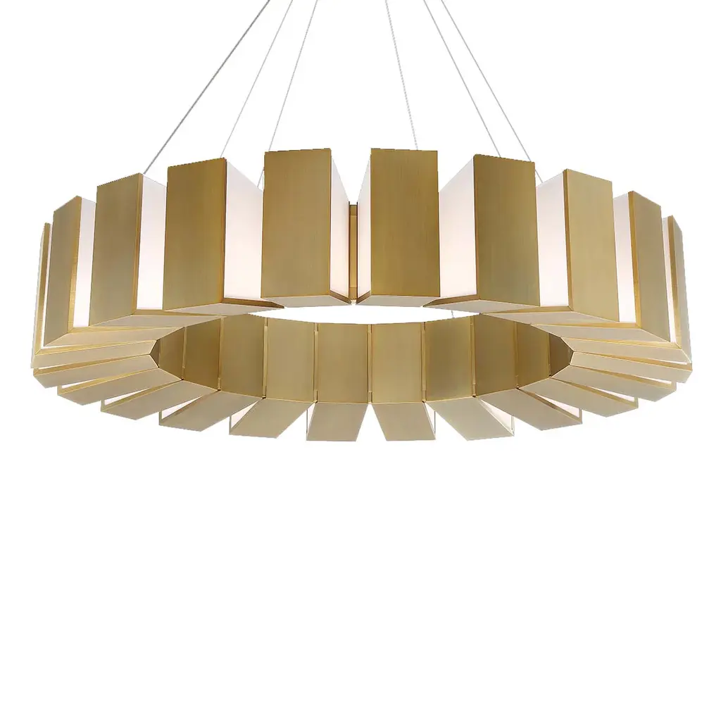 Showcasing a fanning display of illumination, the Chronos LED Pendant by Modern Forms is reminiscent of gears inside a giant clock. Each rectangular bar consists of an Aged Brass-front and Acrylic side panels, reflecting and refracting light from integrated LEDs in a dynamic indirect fashion. Suspends from a round matching canopy with slender cords, contrasting levity with the fixture's rugged, mechanistic presence, creating a visually appealing aesthetic.