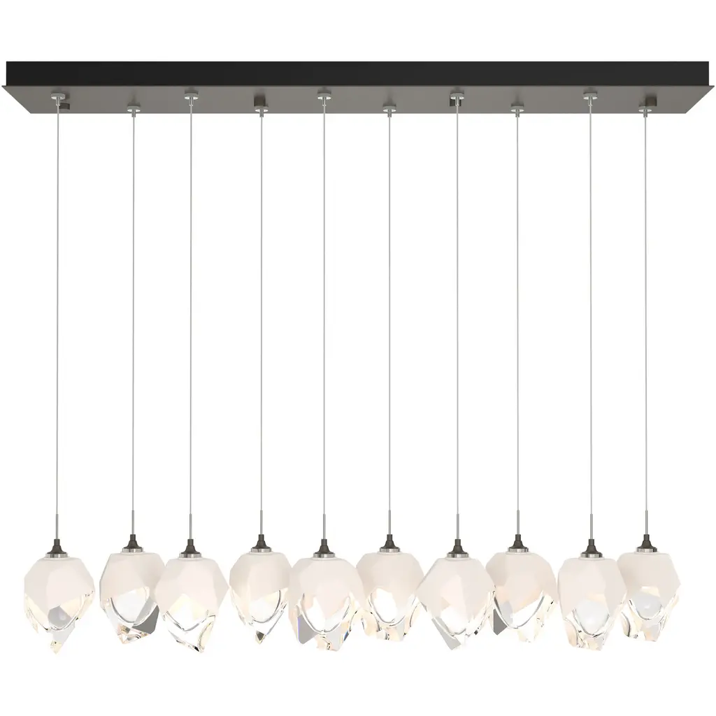 Five Large Chrysalis pendants and five Small Chrysalis pendants hung from a rectangular canopy. Each pendant may be individually adjusted for a custom look. Note, the upper canopy can will always be black while the canopy faceplate will match the selected finish.