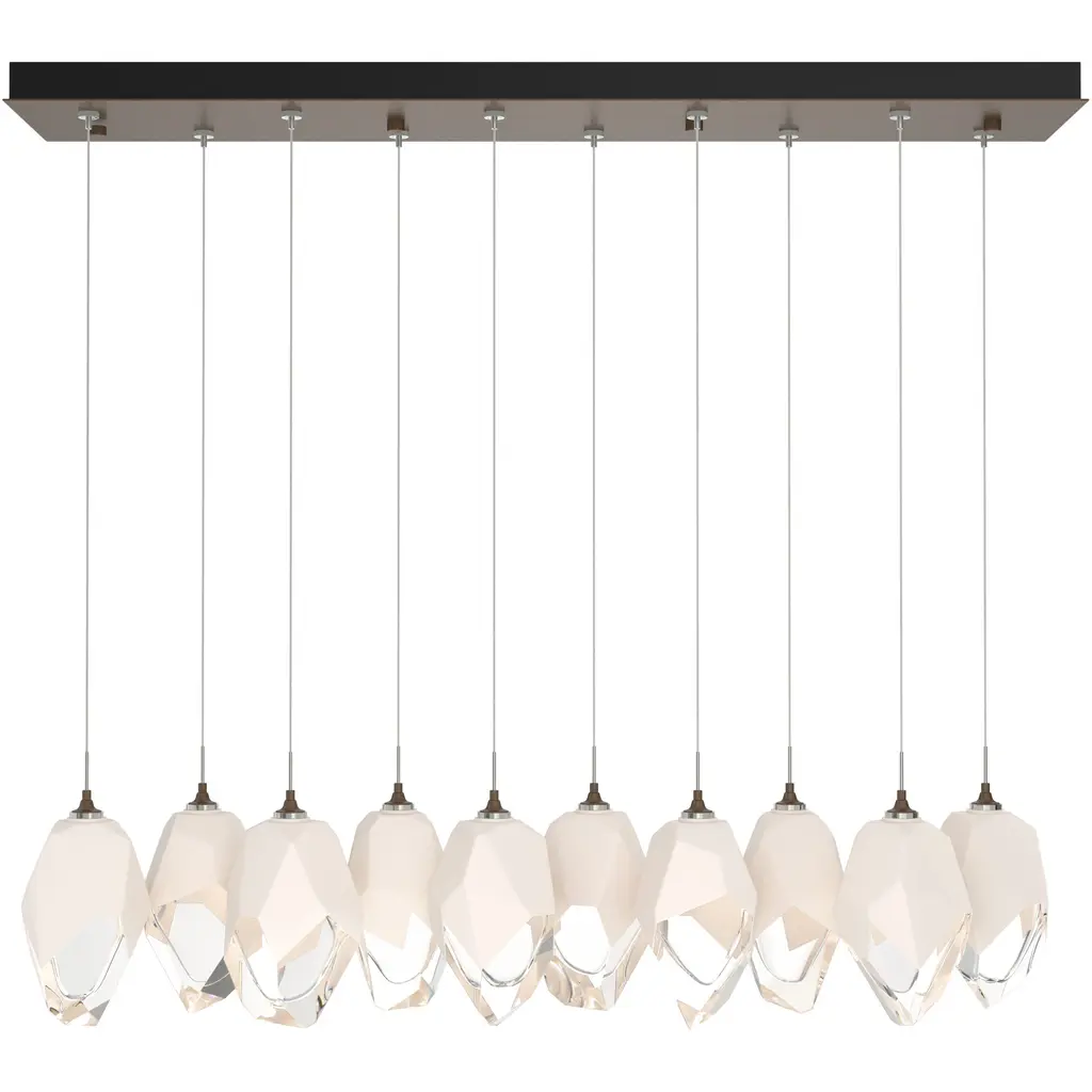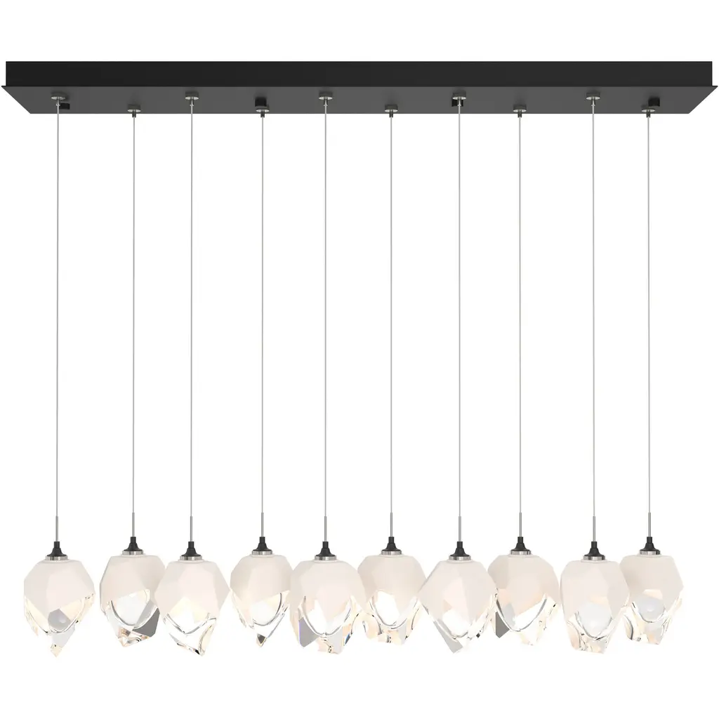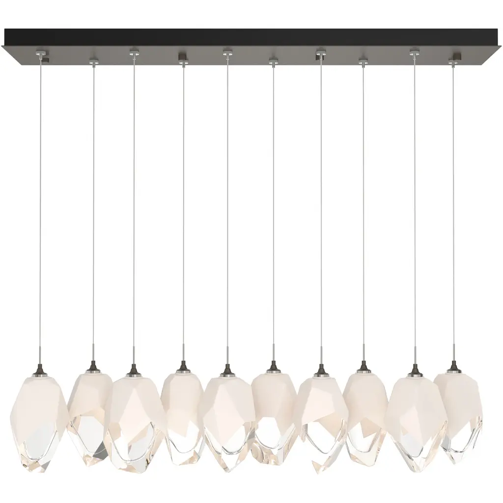 Ten Large Chrysalis pendants hung from a rectangular canopy. Each pendant may be individually adjusted for a custom look. Note, the upper canopy can will always be black while the canopy faceplate will match the selected finish.