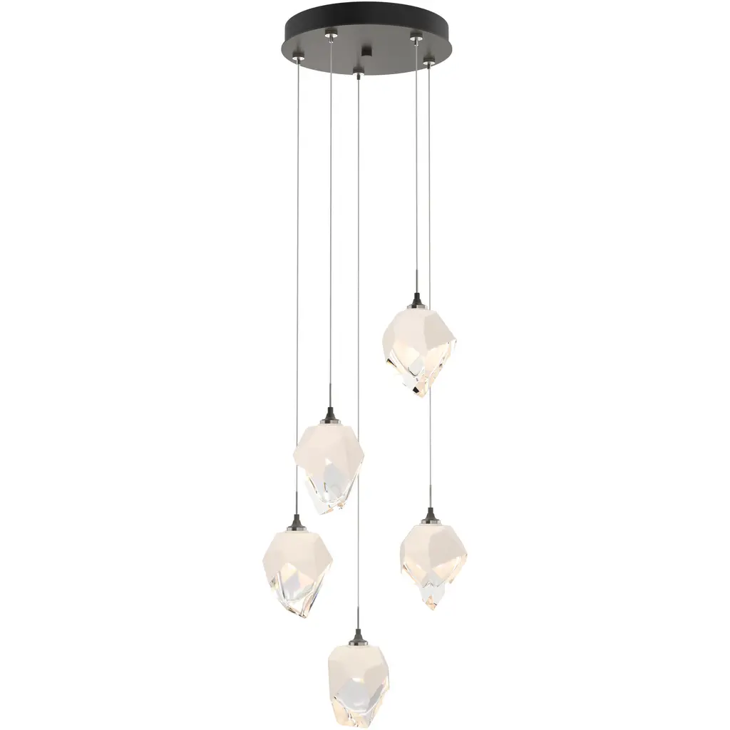 The Chrysalis 5-Light Small Crystal Pendant is a multi-port fixture that features five small, handcrafted faceted glass crystals suspended from a round canopy. A thick, clear layer of glass is encased in an outer cocoon of hand-blown, colored glass (matte black or white; all 5 are same color). The lower portion of the outer layer of glass is removed during a hand-polishing process to reveal the inner crystal clear layer below. Each crystal is lit from within. Customizable cable lengths can be shortened to create a dramatic semi-flush.