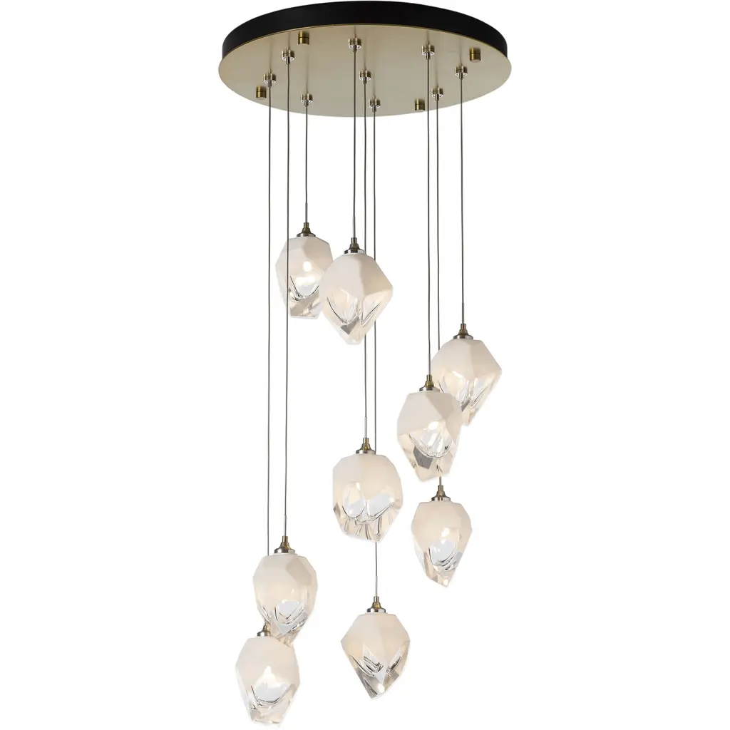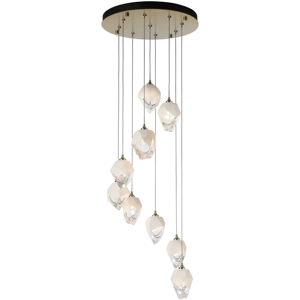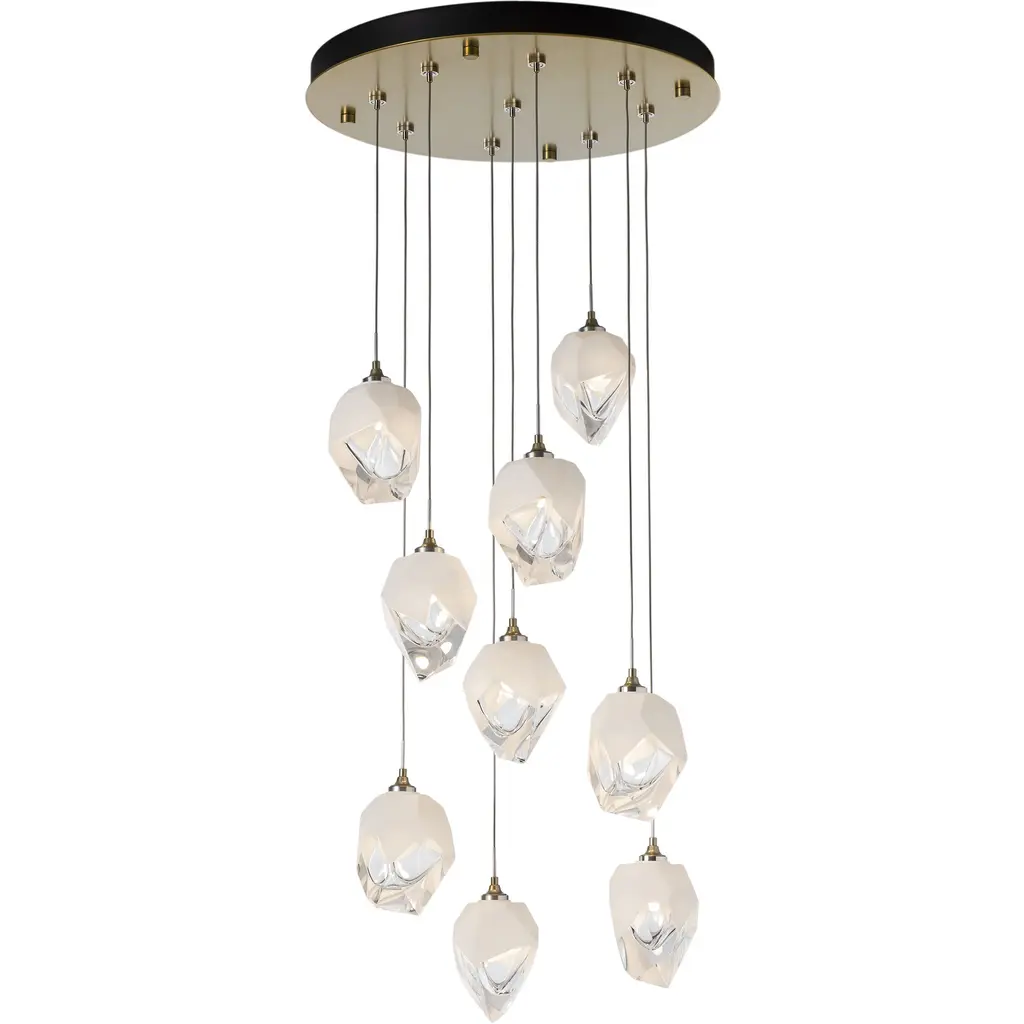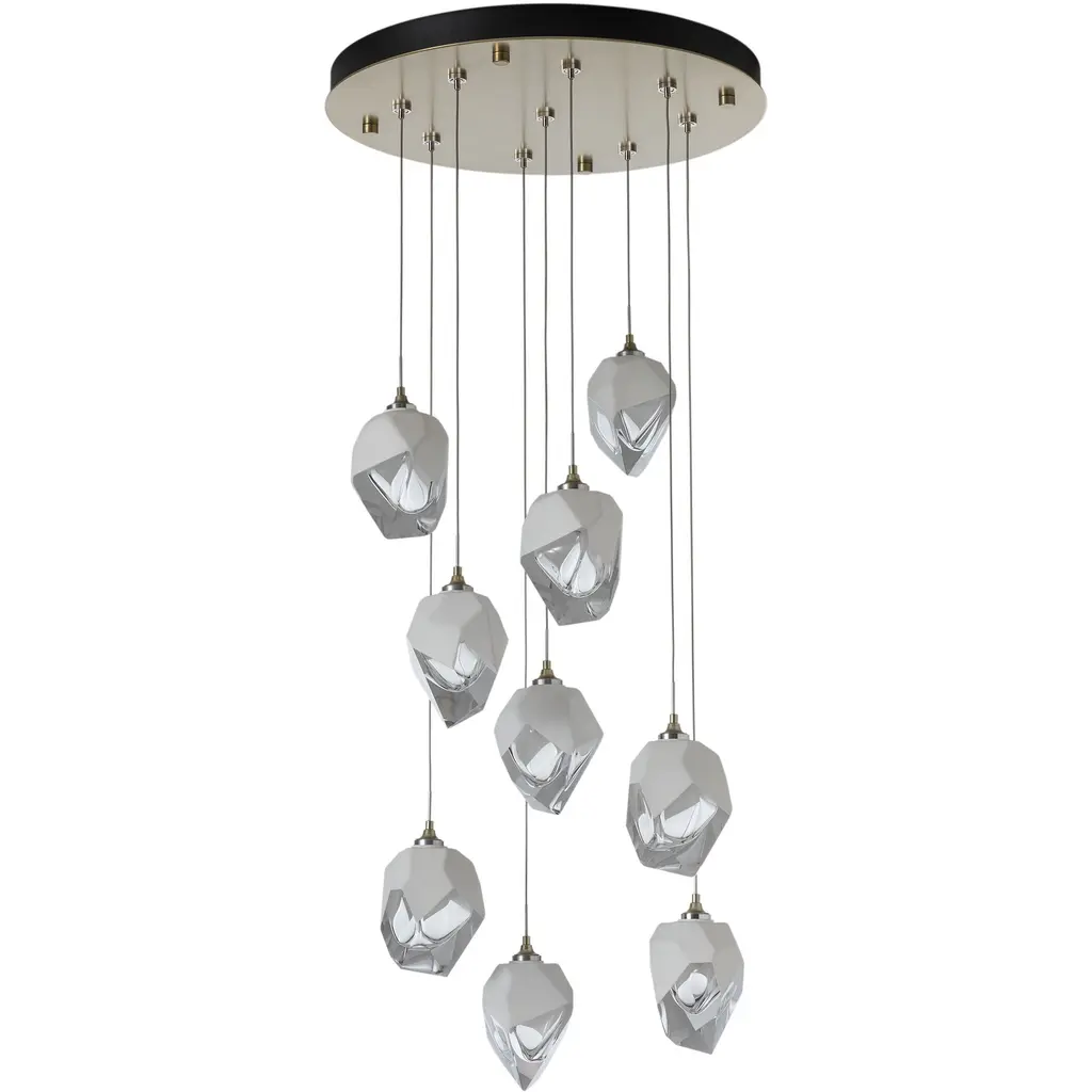The Chrysalis 9-Light Small Crystal Pendant is the perfect focal piece for a stairwell or other central or corner space where cascading crystals lit from within create a waterfall of light when pendants are staggered. Highly-customizable, each individual crystal light is suspended via low-voltage cable from its round canopy. A thick, clear layer of glass is encased in an outer cocoon of hand-blown, colored glass (matte black or white; all 9 are same color). The lower portion of the outer layer of glass is removed by hand-polishing it, revealing the inner clear layer below.