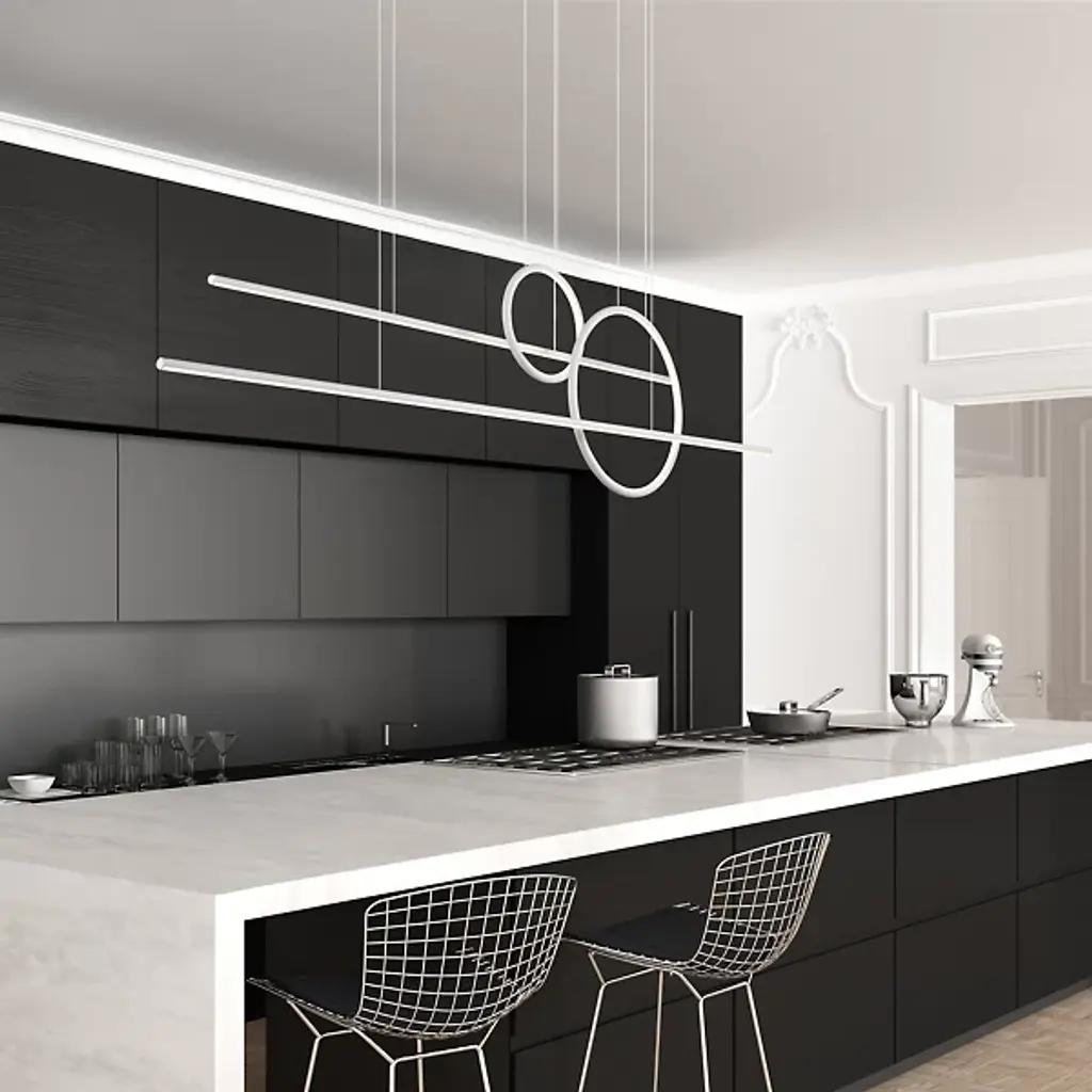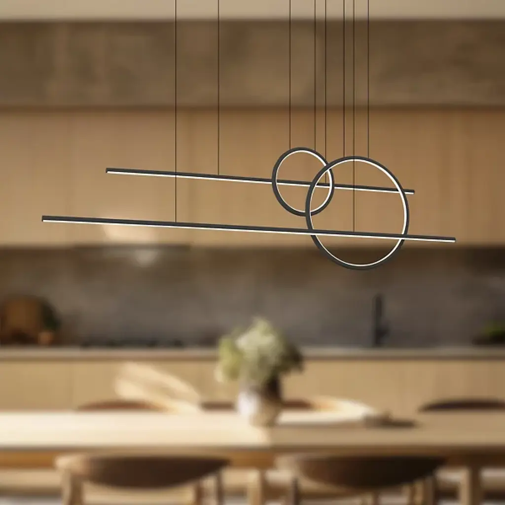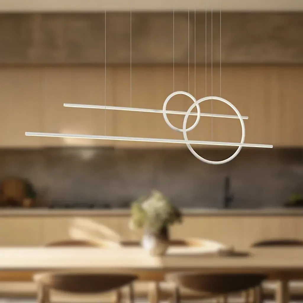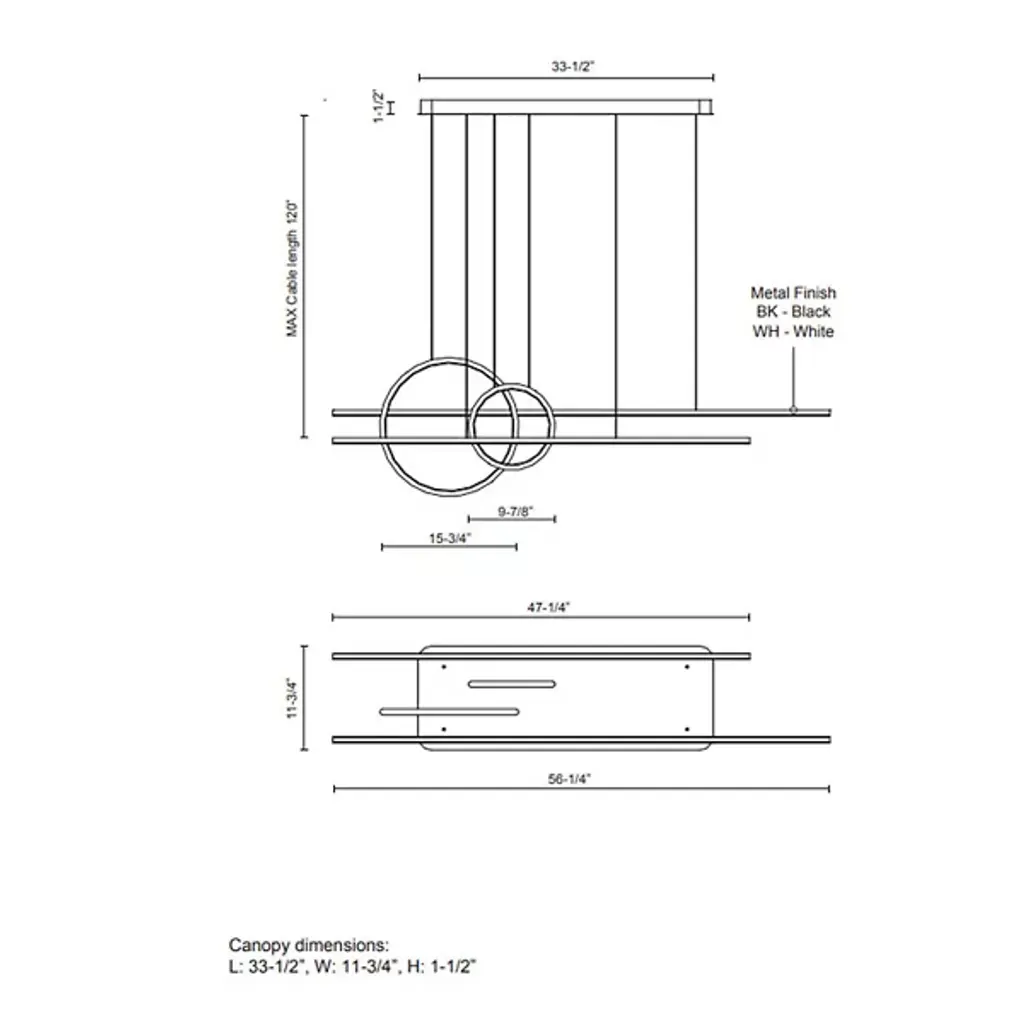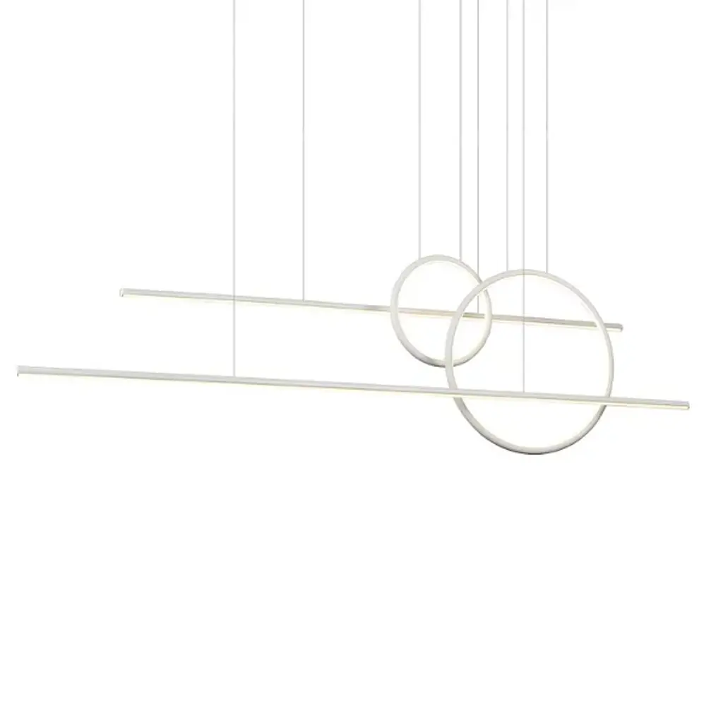 Composed of circles and lines. The Chute Calypso LED Pendant from Kuzco Lighting brings together two sets of rings and cylinders, there’s a small one and a large one of each, to create a modern design that complements kitchens, entryways, and dining rooms. This product produces both up and down lighting, filling your space with an ample amount of illumination that becomes diffused by the Round Opal Silicone diffusers. It has the ability to dim the light, but it must be paired with an Electronic Low Voltage Dimmer (sold separately). You can adjust the included 120” of cable to accommodate your ceiling height.