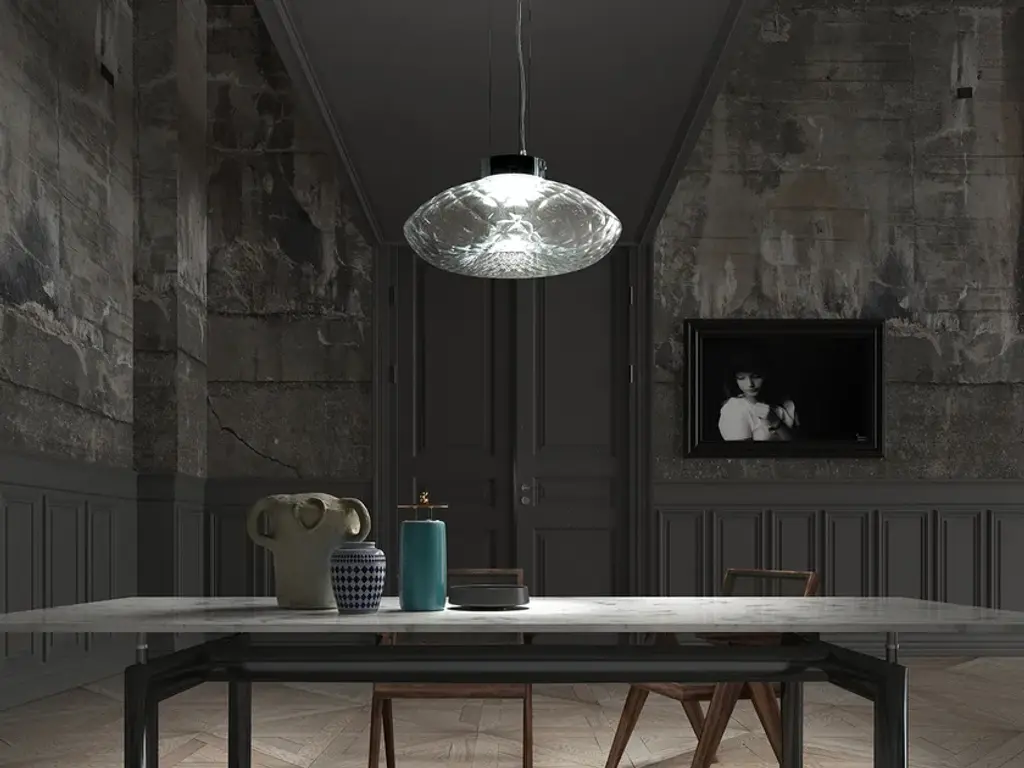 Cicla is a pendant lamp, with direct light, in fine blown glass and is part of homonymous collection of Italamp.Electrical and technical characteristicsLED: 21wLumen: 2500Temperature: 3000 KCRI>80Driver: DALI (supplied with dimmable driver), on request available with Casambi bluetoothVoltage: 230 VEnergy class: A+IP20Certifications: CE/EACCicla collecion offers an elegant look that will impress with its circular blown glass diffuser that is accented by the details in iron grey or chrome metal finish.It is made with the highest quality materials, showcasing the elegance and beauty of each element in all its versions: suspension, ceiling and table lamp in smoked, white or transparent glass.
