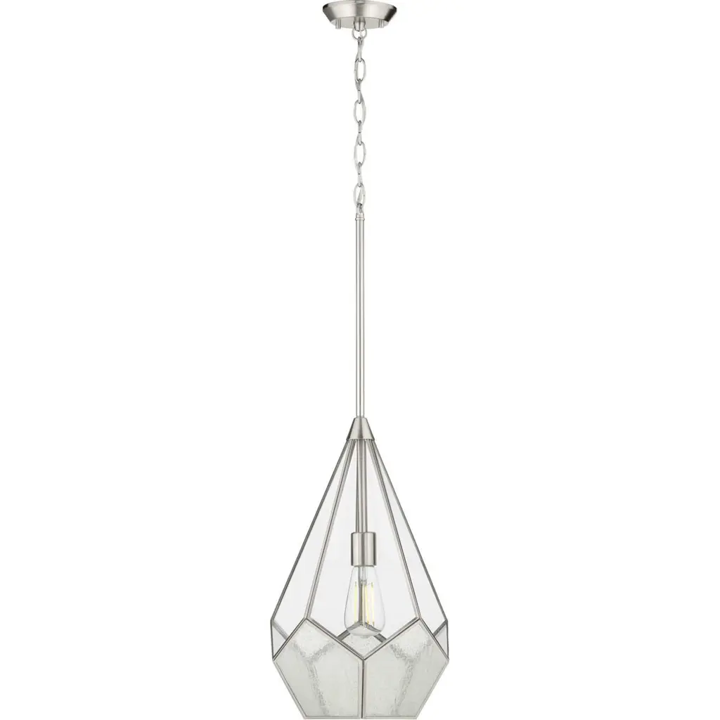 Inspired by modern geometric designs and contrasting elements, this bohemian-style pendant is an attention-grabber for all the right reasons. Geometric shapes form from the brushed nickel frame. Glass panels create a shade that holds an industrial light base inside.