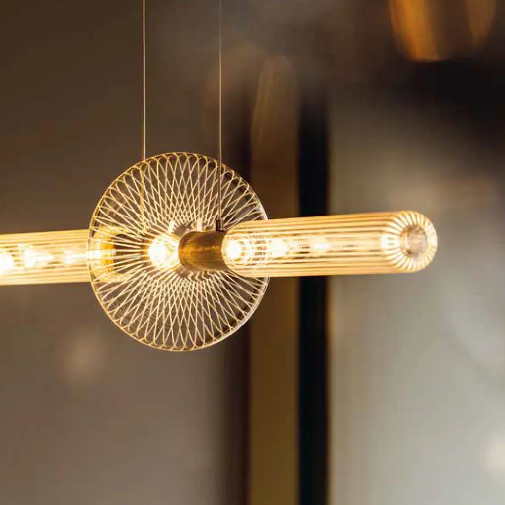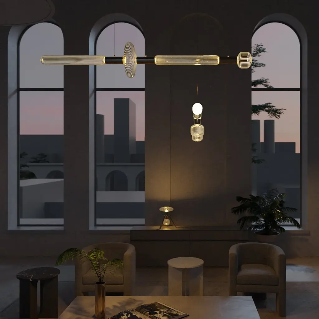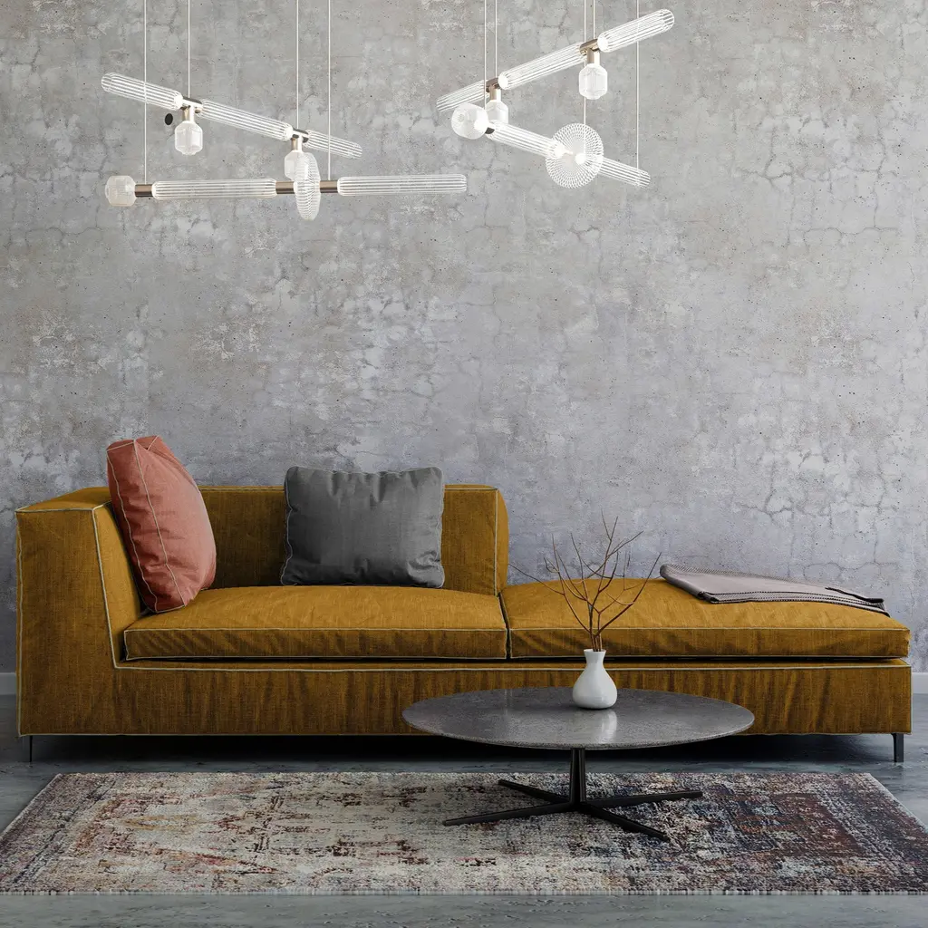 A poetic rhythm of light suspended in air, the Cipher Horizontal Pendant from Lasvit is a sophisticated design by Yabu Pushelberg. Expertly handcrafted in the Czech Republic, this piece features a series of hand-blown crystal cylinders with clean, precise cuts. Light emanates only from the polished connection points, with the sources ingeniously hidden to create a soft, ambient effect. This linear arrangement of glowing cylinders creates a versatile, architectural statement perfect above a dining table or island. Highlights: