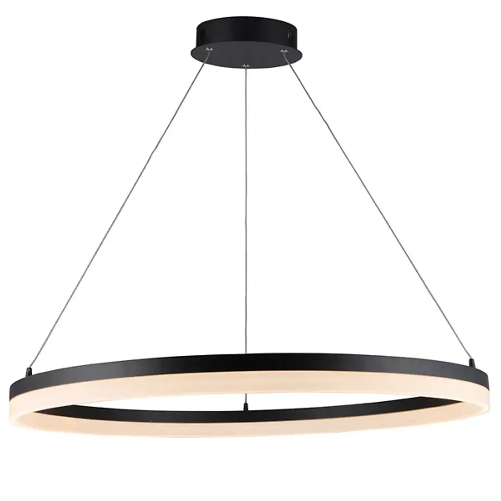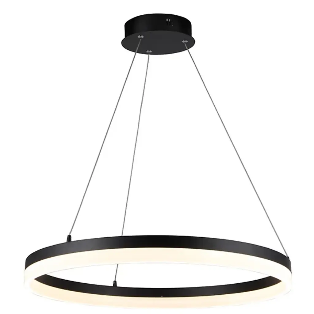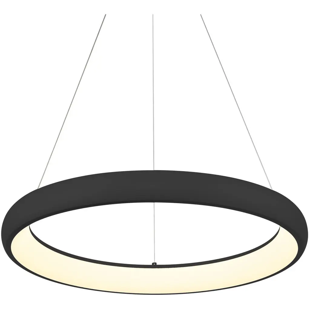 The Circa Round LED Pendant by Avenue Lighting is a glowing example of modern minimalism. This stark fixture hangs from a series of slender cables; its ring-shaped frame consisting partly of robust metal and partly of opal glass. A powerful but energy-efficient beam of LED light illuminates a room and forms a glowing halo in the air, while its simplistic design allows it to be as understated as necessary to suit a room.