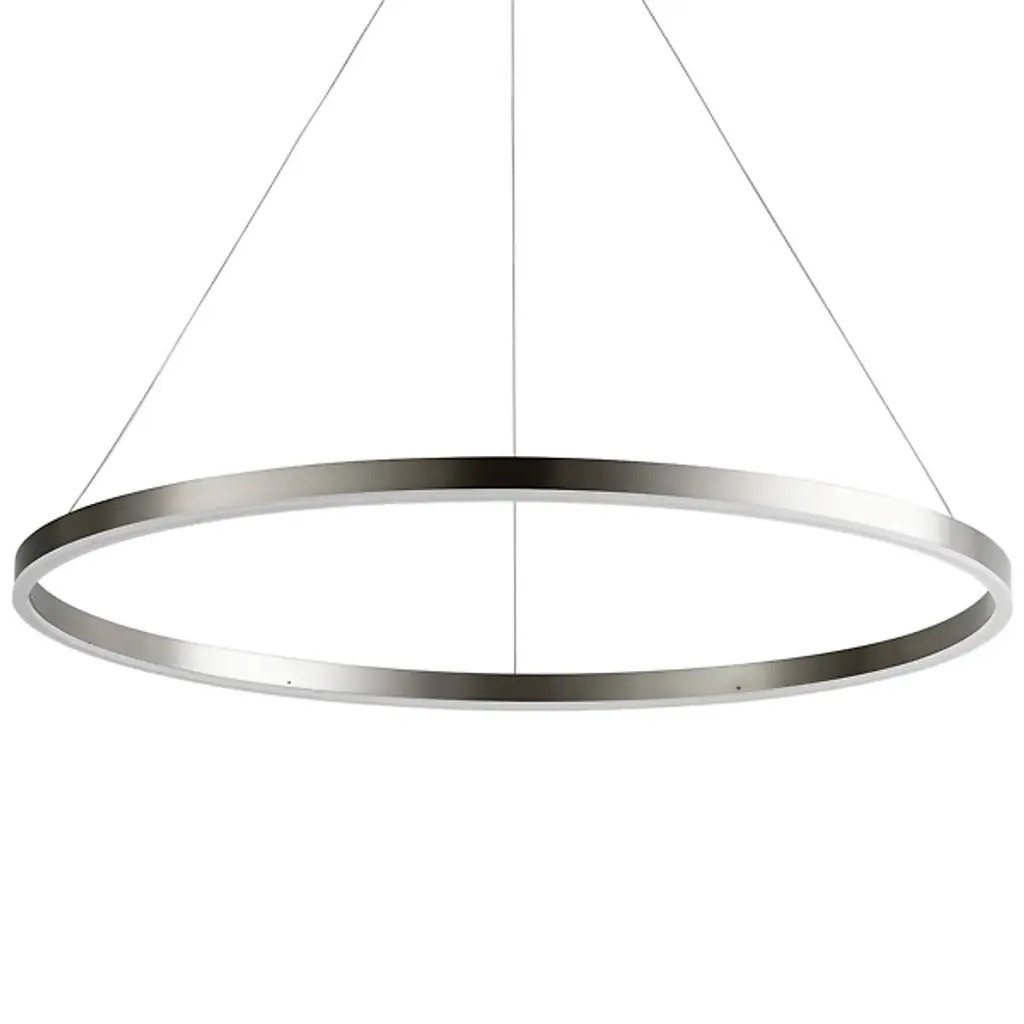The Circulo LED Pendant from Oxygen Lighting displays a seamless blend of function and elemental form. A circular canopy sends thin cables down to a slender steel ring below. The piece appears to hover gracefully in the air, while it glows warmly with light from an integrated LED strip. A matte white acrylic diffuser lines the bottom of the ring, filtering its light to create a balanced illumination that fills the room with a pleasant air.