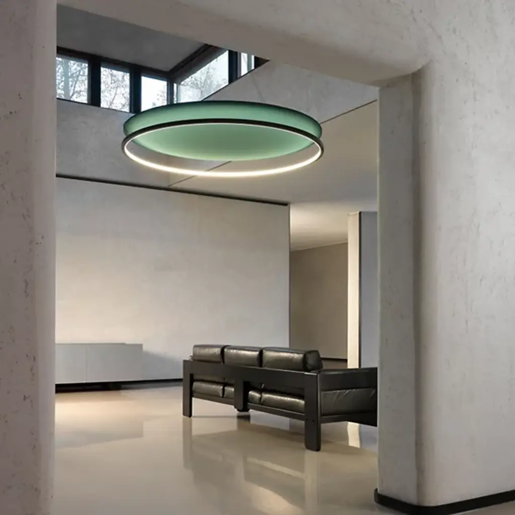 The Circus Round Large Acoustic Lighting LED Pendant with Uplight from Andcosta is designed by Carlo Zerbaro. Sized for large spaces, It celebrates minimalism with its ring shape and refined aluminum composition. The framework of this pendant is accented by a shade of glass that is effortlessly illuminated by an integrated LED for even light distribution throughout your living space. This sloped-ceiling adaptable piece can be placed in a variety of settings. The acoustic panel has a sound-absorbing sheet, and removable upholstery gives it antibacterial properties.