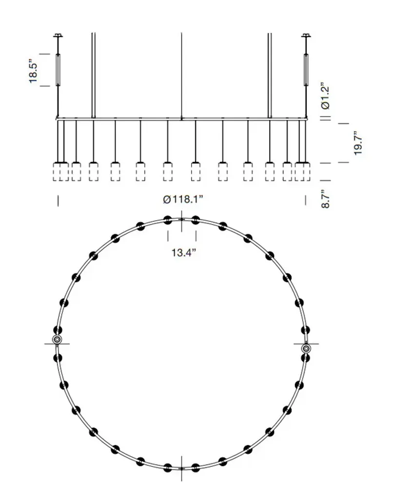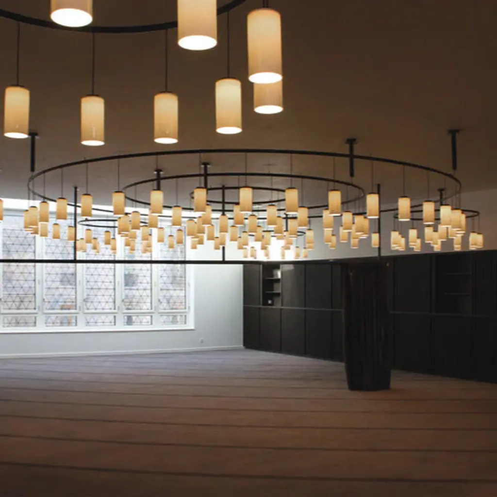 This system was designed with a view to using LED technology to create non-aggressive lighting for large spaces, inspired by the great lamps of Istanbul's Hagia Sophia mosque. The polyvalent structure allows for circles with differing diameters to produce a range of formats. When combined, these circles create a rich play on composition. Created for large-scale projects with unique lighting requirements, Cirio Oval combines straight lines and semi-circles, producing lamps that are as large as necessary. Its design easily accommodates changing the shade to create different ambiences and arrangements from Sargadelos porcelain (lighting up with the warmth of an altar candle) to translucent opal glass or the opaque grace of brass. Features