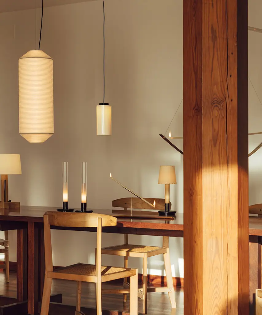 The wall version of Cirio allows the light to be placed at a closer scale to the user. This creates a succession of rhythms that, in repetition, lead the path. The shades, in polished brass, porcelain, or opal glass, are supported by an elegant and subtle aluminum line. Produced by the Barcelona-based lighting purveyor, Santa & Cole.