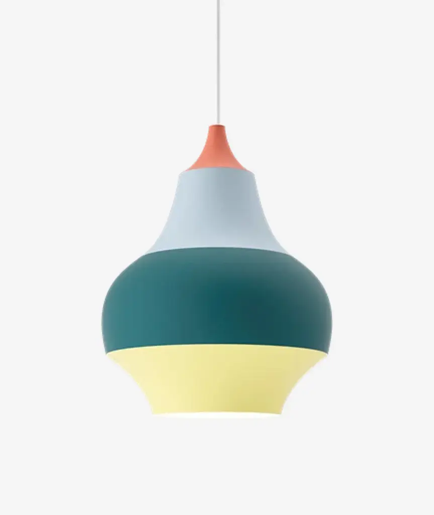 The Cirque Pendant is a play between colors and forms inspired by balloons, carrousels, colors and light. The idea to the color rankings comes from the experience of colors in circular motions where they often are perceived as continuous lines. The shape is inspired by the well-known onion shaped domes on several of the buildings in the TIVOLI garden. The fixture provides a downward glare-free soft light by means of the white lacquered inner reflector.