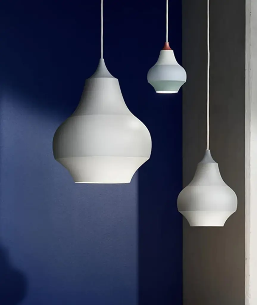 The Cirque Pendant is a play between colors and forms inspired by balloons, carrousels, colors and light. The idea to the color rankings comes from the experience of colors in circular motions where they often are perceived as continuous lines. The shape is inspired by the well-known onion shaped domes on several of the buildings in the TIVOLI garden. The fixture provides a downward glare-free soft light by means of the white lacquered inner reflector.